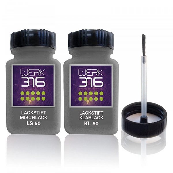 1 x WERK316-LS50 Lackstift 50ml CADILLAC 26W-173B DARK NAVY BLUE ![]() Beschreibung SPEZIAL LACKSTIFT SET mit Schraubverschluss und integriertem Pinsel LS50 ist ein schnelltrocknender, wetter- und lichtbeständiger Fahrzeuglack mit hoher Farbtongenauigkeit auf ACRYL-BASIS. KL50 sorgt als passend auf LS50 abgestimmter Klarlack für Glanz und Schutz. Das Produkt ist besonders geeignet für die schnelle und einfache Bearbeitung kleiner Lackreparaturen im PKW-/LKW- und Motorradbereich sowie an anderen Fahrzeugen. Geeignet für Blech- und Kunststoffteile (nach Verwendung unseres Kunststoffhaftvermittlers). Produktvorteile sehr gute Deckkraft = ausgezeichnete Haftung geringe Läuferbildung guter Verlauf = glatte Oberfläche hoher Festkörpergehalt schnelle Trocknung auch bei niedrigen Temperaturen kratzunempfindlich = stoß;- und schlagfest schmutzunempfindlich und polierfähig hohe Oberflächenhärte bei gleichzeitig guter Elastizität wetterbeständig = lichtecht / UV-resistent Anwendung Vor der Anwendung ist die Oberfläche gründlich zu reinigen und evtl. von Rost entfernen. Die zu behandelnde Oberfläche muss fett-, staubfrei und trocken sein, wenn notwendig leicht anschleifen. Einfache Verarbeitung, hohe Ergiebigkeit und schnelle Trocknung. Beachten Sie vor der Anwendung auch etwaige Hinweise auf den Produktverpackungen.