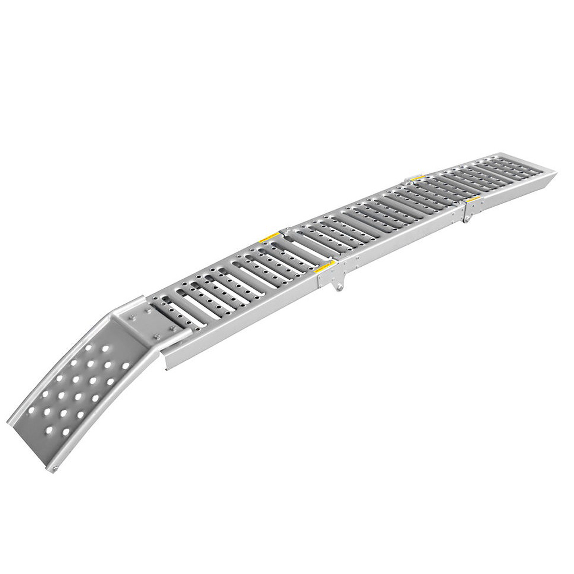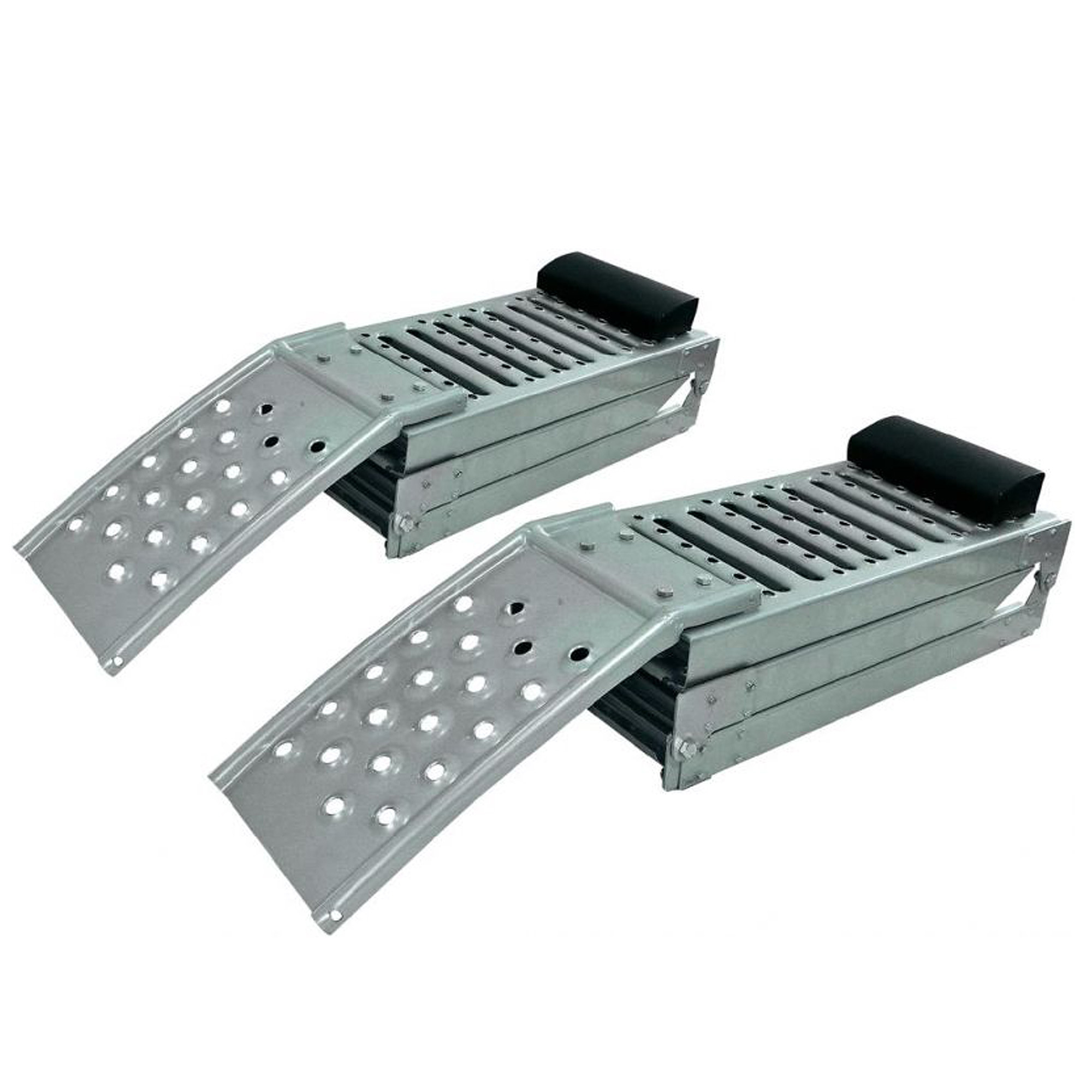 Die Rampe ist im zusammengeklappten Zustand bestens für Wartungen und Reparaturen an verschiedenen Fahrzeugen geeignet. Das Überrollen wird mit zwei Stoppbolzen verhindert.