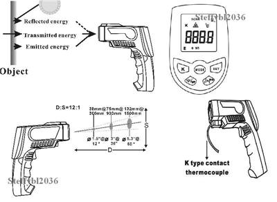 Infrared thermometer measures the surface temperature of an object. Then unit's optics sense emitted, reflected, and transmitted energy which is collected and focused onto a detector. The unit's electronics transmitted energy which is displayed on the unit. For increasing ease and accuracy, the laser pointer makes aiming even more precise.