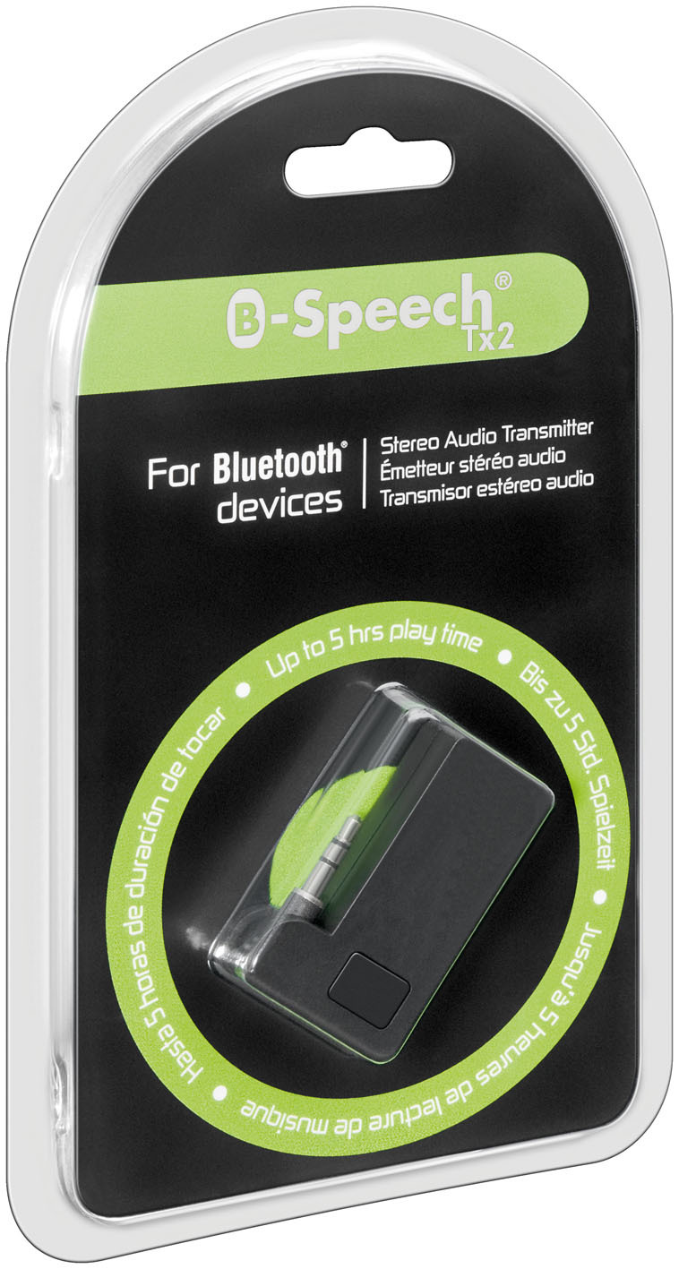TX2Bluetooth Audio-Transmitter (Tx2)Universal Audio/Stereo TransmitterB-Speech TX2, Blister - Universal Audio/Stereo Transmitter Universal Audio/Stereo Transmitter überträgt Musikdaten von Ihrem nicht Bluetoothfähigem MP3-, CD Player,Stereoanlage und anderen Wiedergabegeräten an einen Bluetooth Empfänger Frequenz: 2.4 GHZ 3,5 mm stereo audio Klinkenstecker, 190° schwenkbar Schlafmodus zur Energieeinsparung Arbeitszeit:5 Stunden