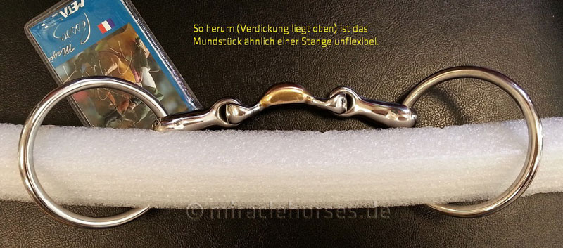 Durch die besondere Machart bleibt die Beweglichkeit des Gebisses nach vorn erhalten, dafür werden die oft unangenehme Rotation bzw. ein Verschieben im Maul nach hinten vermieden.