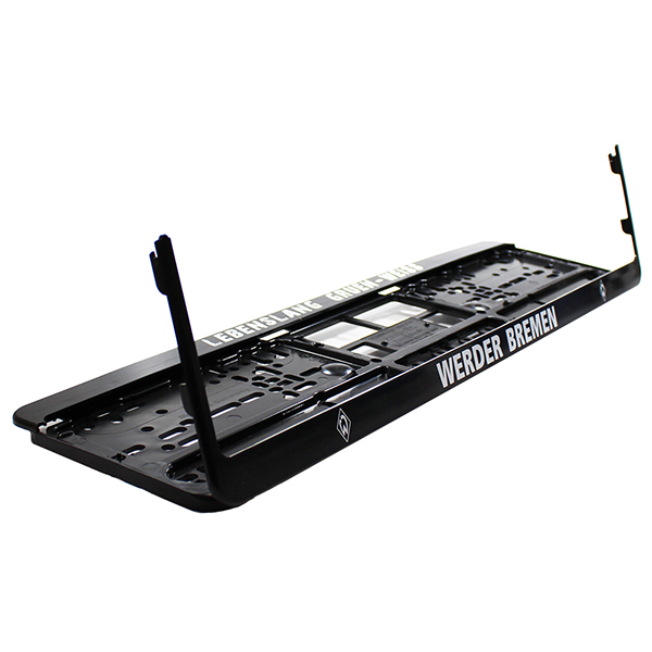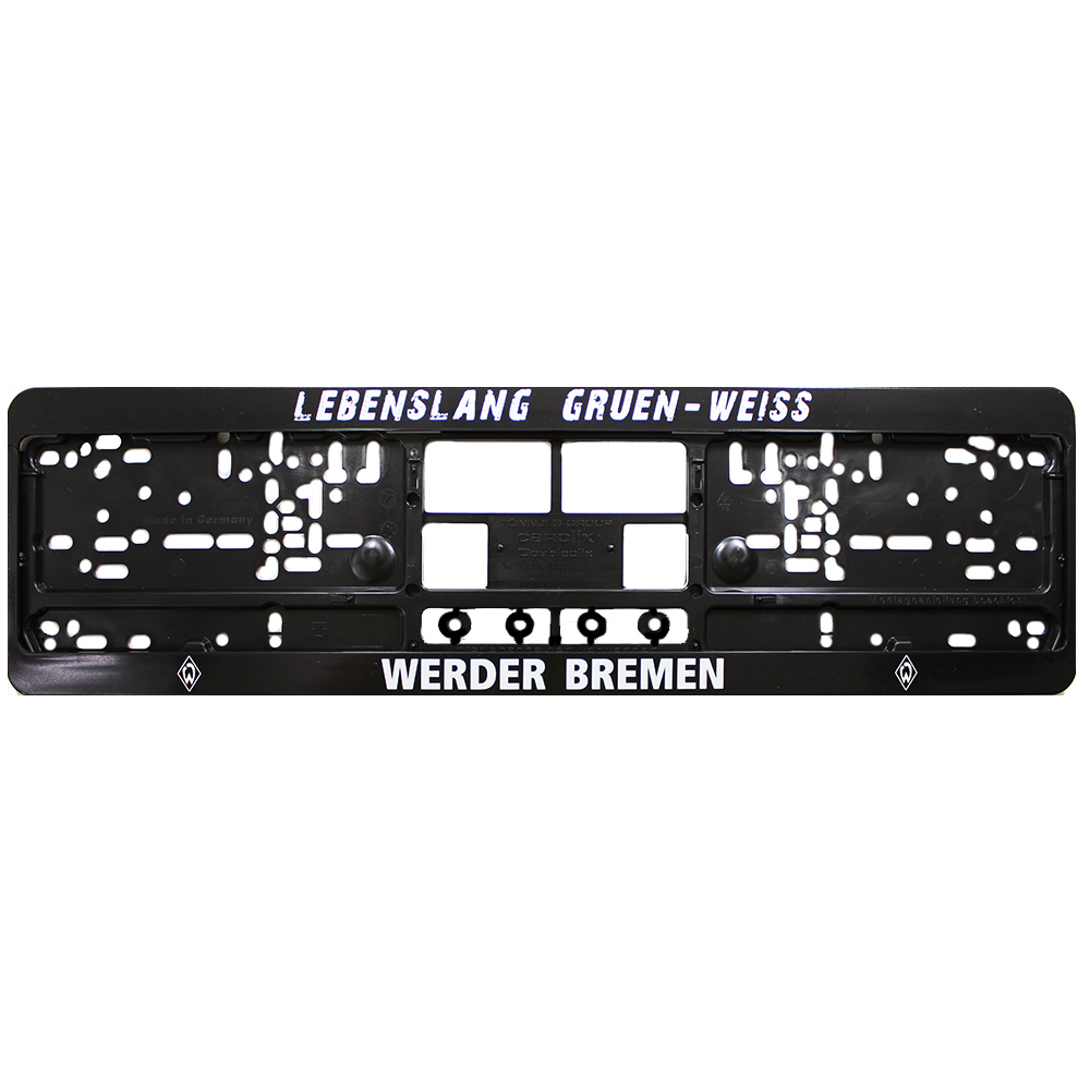 SV Werder Bremen Kennzeichenverstärker. 16-80102. SV Werder Bremen Kennzeichenverstärker. Motiv SV Werder Bremen Logos mit dem Schriftzug vom Verein und mit dem Schriftzug - Lebenslang Gruen-Weiss - in einer angesagten Used Optik. Farbe schwarz und weiss. Ein SV Werder Bremen Lizenzartikel. Der SV Werder Bremen Fanartikel aus dem Fussball Fanshop 24, dem SV Werder Bremen Shop, für den kleinen und für den großen SV Werder Bremen Fan und sein Auto. Ein SV Werder Bremen Kennzeichenverstärker in einem aufwendig gestalteten Design verbunden mit einer ansprechenden Optik. Ein SV Werder Bremen Fanartikel der das Herz eines jeden SV Werder Bremen Fans erwärmen und auch höher schlagen lassen kann. Zu dem Motiv zählt ein zentral angeordneter Schriftzug vom Verein zwischen zwei seitlich angeordneten Logos vom Verein und dem Schriftzug - Lebenslang Gruen-Weiss - . In der Ausführung zeigt sich dieser SV Werder Bremen Kennzeichenverstärker in einer angesagten Used Optik was gleichbedeutend damit ist das der Schriftzug - Lebenslang Gruen-Weiss - in der Ausführung verwaschen und benutzt aussieht. Dieser SV Werder Bremen Kennzeichenhalter der auch als Kennzeichenverstärker seine Wirkung zeigen kann ist einfach und ohne größeren Aufwand zu montieren denn dank der vielen vorgefertigten Bohrungen beziehungsweise Möglichkeiten der Befestigung in der Rückseite der Halterung kann dieser SV Werder Bremen Kennzeichenhalter mühelos und ohne ein weiteres Bohren an fast jedem Fahrzeug befestigt beziehungsweise angebracht werden. Konzepiert ist dieser SV Werder Bremen Nummernschildhalter zur Aufnahme von einem Autokennzeichen mit einer Größe von 520 mm x 110 mm welches dem Standardmaß eines normalen KFZ Kennzeichens entspricht. Die Aufnahme des Kennzeichens erfolgt über eine Schnellbefestigung die es erlaubt das Kennzeichen ohne Bohren in dem Halter aufzunehmen. Hergestellt aus einem elastischen und einem UV-beständigen Polypropylen, gefertigt nach der EU-Richtlinienverordnung 74/483/EWG, dem Gesetz über die vorstehenden Außenkanten bei Kraftfahrzeugen, die unter anderem fordert, dass alle Teile einen mindestens 2,5 mm Abrundungsradius an den Kanten aufweisen müssen und das eckige Kanten nicht mehr erlaubt sind. Dieser SV Werder Bremen Kennzeichenverstärker - Lebenslang Gruen-Weiss - ist in der Farbe schwarz und weiss gehalten. Ein absoluter Hingucker auf der Straße und im Gelände der in seiner Art und in seiner Ausführung überzeugen kann. Mit diesem SV Werder Bremen Kennzeichenverstärker am Auto weiß jeder auf der Straße das hier ein Werderaaner unterwegs ist! Das Material ist ein UV-beständiges Polypropylen. Flexibel, schlagfest und waschanlagenresistent. Ein offizielles Lizenzprodukt vom Verein. In der Lieferung enthalten ist ein Stück SV Werder Bremen Kennzeichenverstärker - Lebenslang Gruen-Weiss - . Eventuell benötigtes Montagematerial beziehungsweise zusätzlich benötigte Anbauteile und eine Montageanleitung sind im Lieferumfang nicht enthalten und sind auch kein Bestandteil dieses Angebotes. Der SV Werder Bremen Kennzeichenverstärker - Lebenslang Gruen-Weiss - ist neu und ohne Etikett.