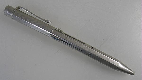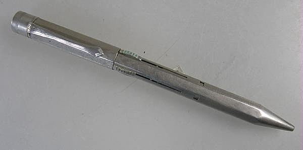 feines Wellenmuster im Wechsel mit ungewöhnlichen Streifenmuster auf 8 Kanten, Alpacca, hergestellt ca. um 1950, bezeichnet bzw. gemarkt vom Hersteller: "Fend Patent", i.O., funktioniert, mit Resten der Minen, Länge ca.: 13 cm, leichte bzw. normale Gebrauchsspuren, keine Beulen, keine tiefe Kratzer, keine grobe Beschädigungen, sehr guter gebrauchter Zustand 1-.>