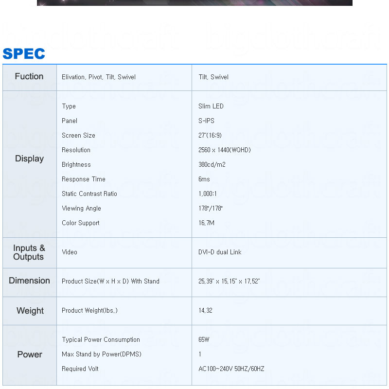 Display Type: Slim LED Panel: S-IPS Screen Size: 27"(16:9) Resolution: 2560 x 1440(WQHD) Brightness: 380cd/m2 Response Time: 6ms Static Contrast Ratio: 1,000:1 Viewing Angle: 178˚/178˚ Color Support: 16.7M