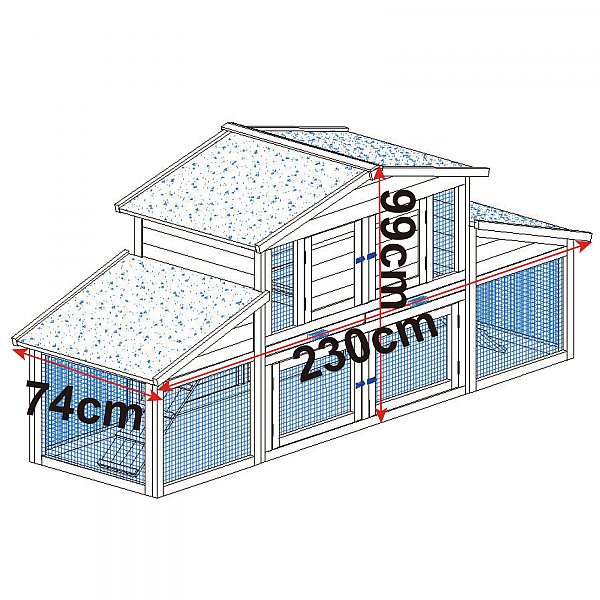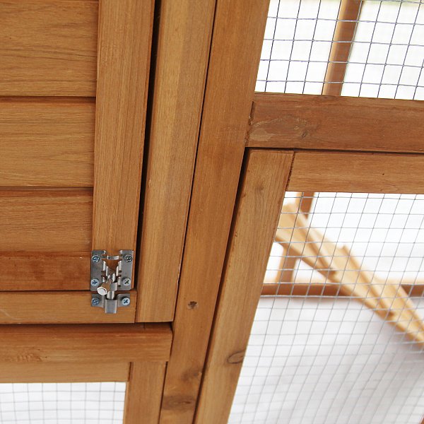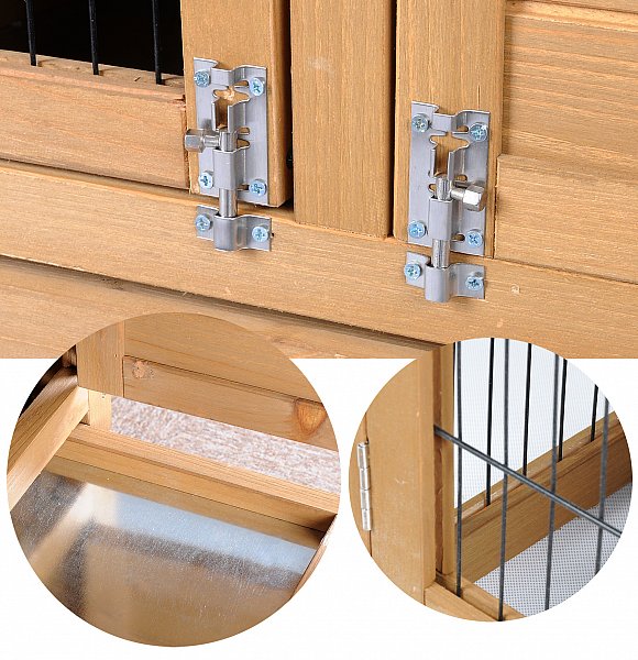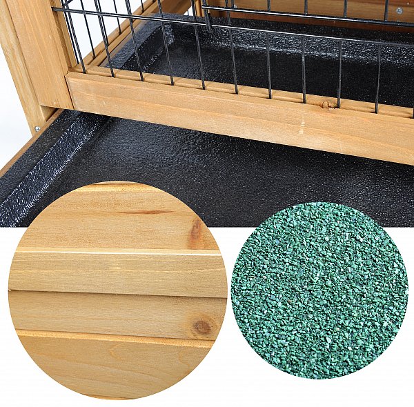 >> Auf dem Wetterfesten Dach ist der Stall mit grüner Teerpappe bezogen. Er ist aufklappbar, und mit einem Haken zu befestigen. >> Die beiden Schubladen mit eingelassener Kunststoffwanne, die über die ganze Breite des Käfigs reichen, erleichtern die Reinigung.