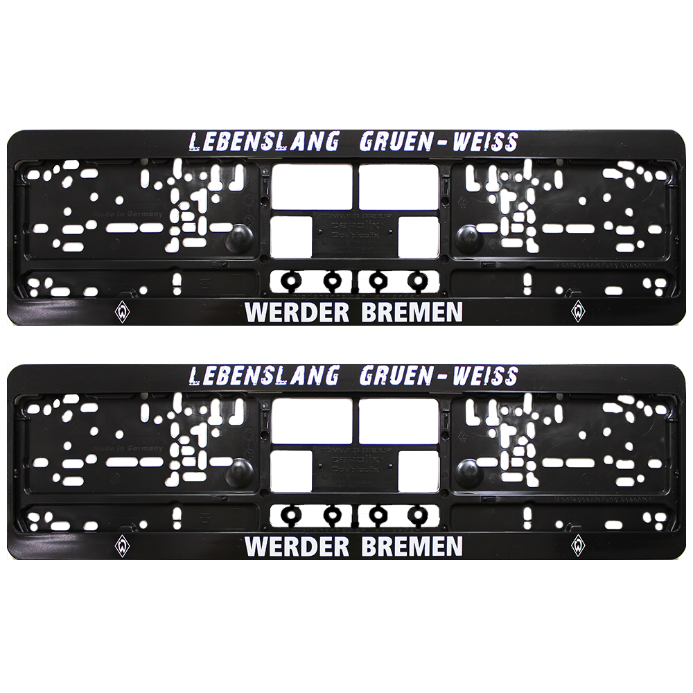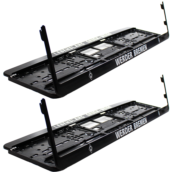 SV Werder Bremen Kennzeichenverstärker. 2er-Set. Zwei SV Werder Bremen Kennzeichenverstärker. Motiv SV Werder Bremen Logos mit dem Schriftzug vom Verein und mit dem Schriftzug - Lebenslang Gruen-Weiss - in einer angesagten Used Optik. Farbe schwarz und weiss. Ein SV Werder Bremen Lizenzartikel. Der SV Werder Bremen Fanartikel aus dem Fussball Fanshop 24, dem SV Werder Bremen Shop, für den Fussballfan aus dem Norden von Deutschland und sein Auto. Zwei SV Werder Bremen Kennzeichenverstärker in einem aufwendig gestalteten Design verbunden mit einer ansprechenden Optik. Ein SV Werder Bremen Fanartikel der das Herz eines jeden SV Werder Bremen Fans erwärmen und auch höher schlagen lassen kann. Zu dem Motiv zählt ein zentral angeordneter Schriftzug vom Verein zwischen zwei seitlich angeordneten Logos vom Verein und dem Schriftzug - Lebenslang Gruen-Weiss - . In der Ausführung zeigen sich diese beiden SV Werder Bremen Kennzeichenverstärker in einer angesagten Used Optik was gleichbedeutend damit ist das der Schriftzug - Lebenslang Gruen-Weiss - in der Ausführung verwaschen und benutzt aussieht. Diese beiden SV Werder Bremen Kennzeichenhalter die auch als Kennzeichenverstärker ihre Wirkung zeigen können sind einfach und ohne größeren Aufwand zu montieren denn dank der vielen vorgefertigten Bohrungen beziehungsweise Möglichkeiten der Befestigung in der Rückseite der Halterung können die SV Werder Bremen Kennzeichenhalter mühelos und ohne ein weiteres Bohren an fast jedem Fahrzeug befestigt beziehungsweise angebracht werden. Konzepiert sind diese beiden SV Werder Bremen Nummernschildhalter zur Aufnahme von einem Autokennzeichen mit einer Größe von 520 mm x 110 mm welches dem Standardmaß eines normalen KFZ Kennzeichens entspricht. Die Aufnahme des Kennzeichens erfolgt über eine Schnellbefestigung die es erlaubt das Kennzeichen ohne Bohren in dem Halter aufzunehmen. Hergestellt aus einem elastischen und einem UV-beständigen Polypropylen, gefertigt nach der EU-Richtlinienverordnung 74/483/EWG, dem Gesetz über die vorstehenden Außenkanten bei Kraftfahrzeugen, die unter anderem fordert, dass alle Teile einen mindestens 2,5 mm Abrundungsradius an den Kanten aufweisen müssen und das eckige Kanten nicht mehr erlaubt sind. Diese beiden SV Werder Bremen Kennzeichenverstärker - Lebenslang Gruen-Weiss - sind in der Farbe schwarz und weiss gehalten. Ein absoluter Hingucker auf der Straße und im Gelände die in ihrer Art und in ihrer Ausführung überzeugen können. Mit diesen SV Werder Bremen Kennzeichenverstärkern am Auto weiß jeder auf der Straße das hier ein Werderaaner unterwegs ist! Das Material ist ein UV-beständiges Polypropylen. Flexibel, schlagfest und waschanlagenresistent. Ein offizielles Lizenzprodukt vom Verein. In der Lieferung enthalten sind zwei Stück SV Werder Bremen Kennzeichenverstärker - Lebenslang Gruen-Weiss - . Eventuell benötigtes Montagematerial beziehungsweise zusätzlich benötigte Anbauteile und eine Montageanleitung sind im Lieferumfang nicht enthalten und sind auch kein Bestandteil dieses Angebotes. Die zwei SV Werder Bremen Kennzeichenverstärker - Lebenslang Gruen-Weiss - sind neu und ohne Etikett.