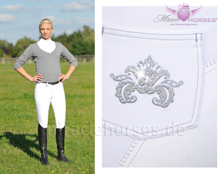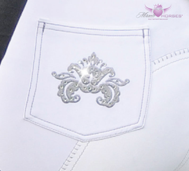 - Taschen im Five-Pocket-Stil mit hellgrauer Bestickung und Strassbesatz