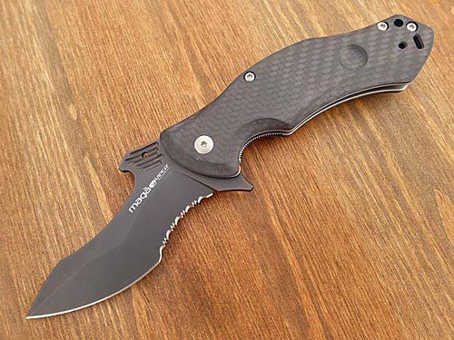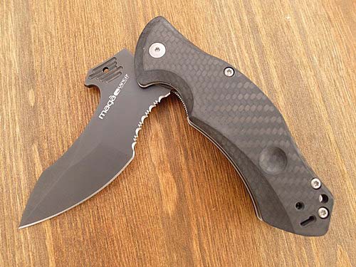 Das handliche Einsatzmesser liegt dank der ausgefeilten Ergonomie in so gut wie jeder Griffhaltung perfekt in der Hand. Schnelle Griffwechsel in den Reverse-Grip oder zurück werden durch die Indexsenkung in den Griffschalen unterstützt. Die charismatische Klingenform bietet Schneidkraft pur, wahlweise unterstützt durch den sehr bissigen Teilwellenschliff im konkaven Teil der Klinge. Die Klinge ist (erstmals bei Viper) kugelgelagert und läuft unglaublich leicht, weich und spielfrei, was das Öffnen per Flipper oder per Daumenkontaktfläche zum Vergnügen macht. N690CO als Klingenstahl ist eine ausgezeichnete Wahl und bietet hervorragende Schnitthaltigkeit. Durch den umsetzbaren Clip und die beidhändigen Bedienelemente ist das Magà auch für Linkshänder geeignet. Liner Lock. PVD-beschichtete Klinge mit Teilwellenschliff und Griffbeschalung aus Carbon