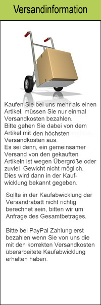 Wir versenden umgehend nach Geldeingang. Bedenken Sie bitte Bank- und Paketlaufzeiten. Sollte die Ware innerhalb von 10 Werktagen nach Ihrer Zahlung noch nicht bei Ihnen angekommen sein, so informieren sie uns bitte per Mail. |
