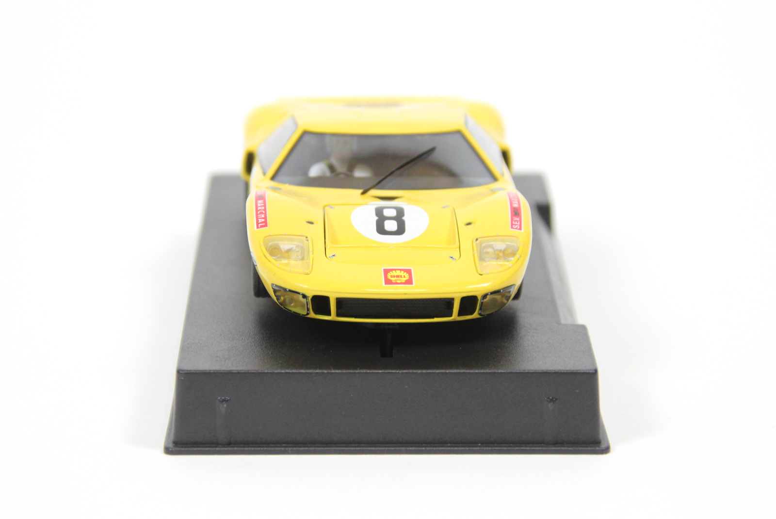 Hierbei handelt es sich um einen Ford GT40 Le Mans 1968 No. 8. Er ist im Grundaufbau aus Kunststoff gefertigt und in gelber Farbe gestaltet. Das Fahrzeug ist für die Nutzung auf einer Rennbahn konzipiert, macht jedoch auch in jeder Vitrine etwas her.
