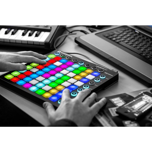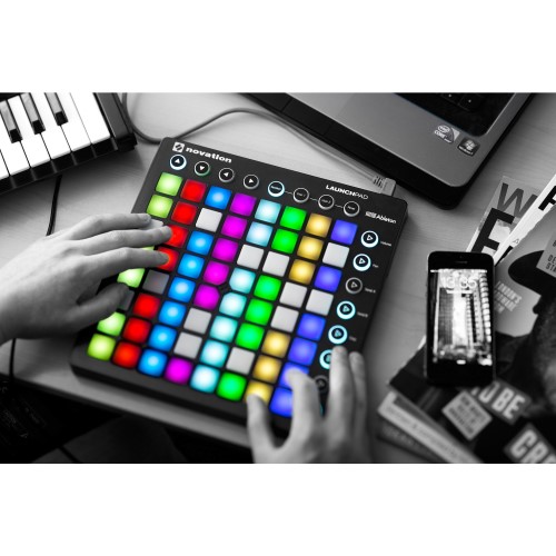 Novation Launchpad MK2 Midi Controller Novation Launchpads 64 Pads integrieren sich ohne Umwege direkt in Ableton Live. Sie sind mit RGB-LEDs beleuchtet, die die gleiche Farbe zeigen, wie die Clips in Ableton Live, so dass man immer sofort sieht, welche Clips gerade abgespielt werden. Neben dem Launchen von Clips und den Kreieren neuer Songs kann man mit dem Novation Launchpad auch den Mixer steuern, Loops starten und stoppen, Spuren scharfschalten oder Pegel, Panoramen und Sends verändern. Launchpad Mk2 bietet die nahtlose Integration in Ableton Live ohne jegliche Verzögerung oder Setup. Auch die überarbeitete Version von Launchpad ist leicht, lässt sich einfach verstauen und kann dank Stromversorgung über USB überall eingesetzt werden. Mehrere Launchpads oder andere Launch-Produkte wie Launch Control, Launch Control XL oder Launchkey können einfach miteinander kombiniert werden, um ein großes Controller-Setup für die perfekte Steuerung von Ableton Live aufzubauen. Neben Ableton Live Lite kommt Novation Launchpad Mk2 mit 1 GB Loopmasters Samples in Profi-Qualität und dem Novation Bass Station Synthesizer als VST- und AU-Plug-in (als Downloads), sodass man alles hat, was man zum Musikmachen benötigt. Natürlich arbeitet Launchpad Mk2 auch mit Novations Launchpad-App für iPad zusammen. Features: