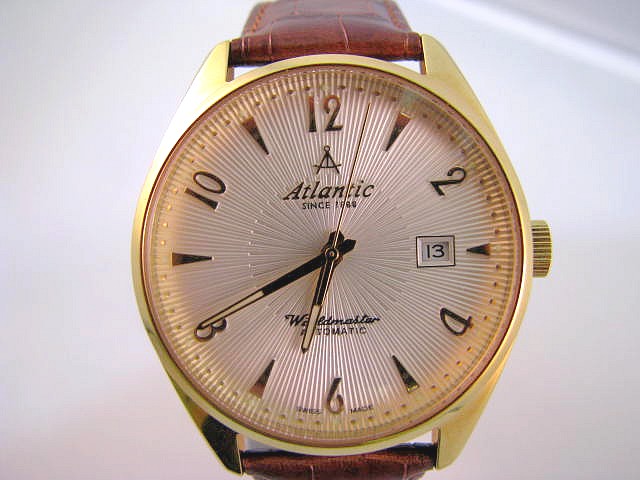 Kontakt: Telefon: +49 (0) 2102 - 889 60 90 Sie Bieten hier auf eine wunderschöne Top Rarität:Atlantic Worldmaster Art Deco Herrenuhr mit einem Automatikwerk. Das Gehäuse der Uhr ist aus vergoldetem Edelstahl und das Glas ist kratzfestes und entspiegeltes Saphirglas. Das Zifferblatt ist silbern und mit vergoldeten Indizes sowie einer Datumsanzeige versehen. Das Armband besteht aus Leder und die Uhr ist wasserdicht bis 5 bar.