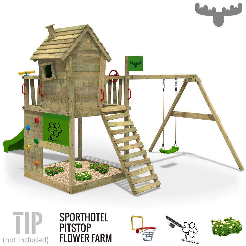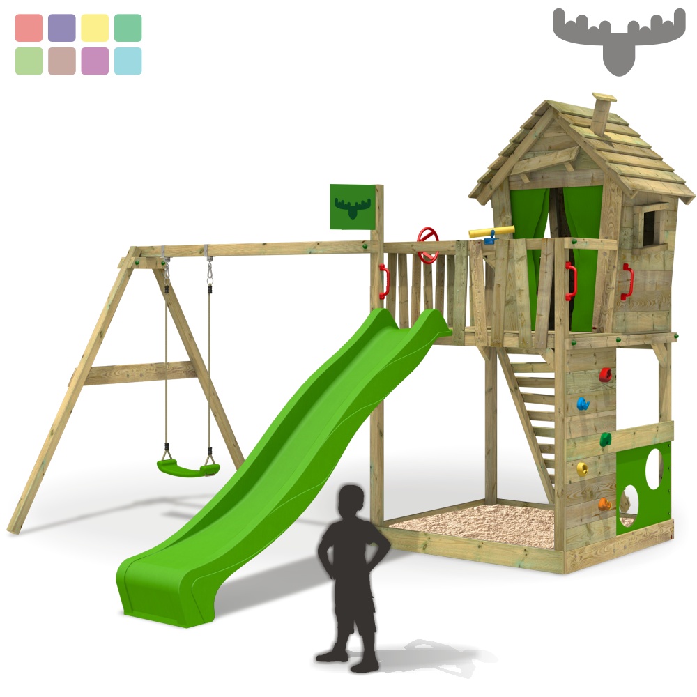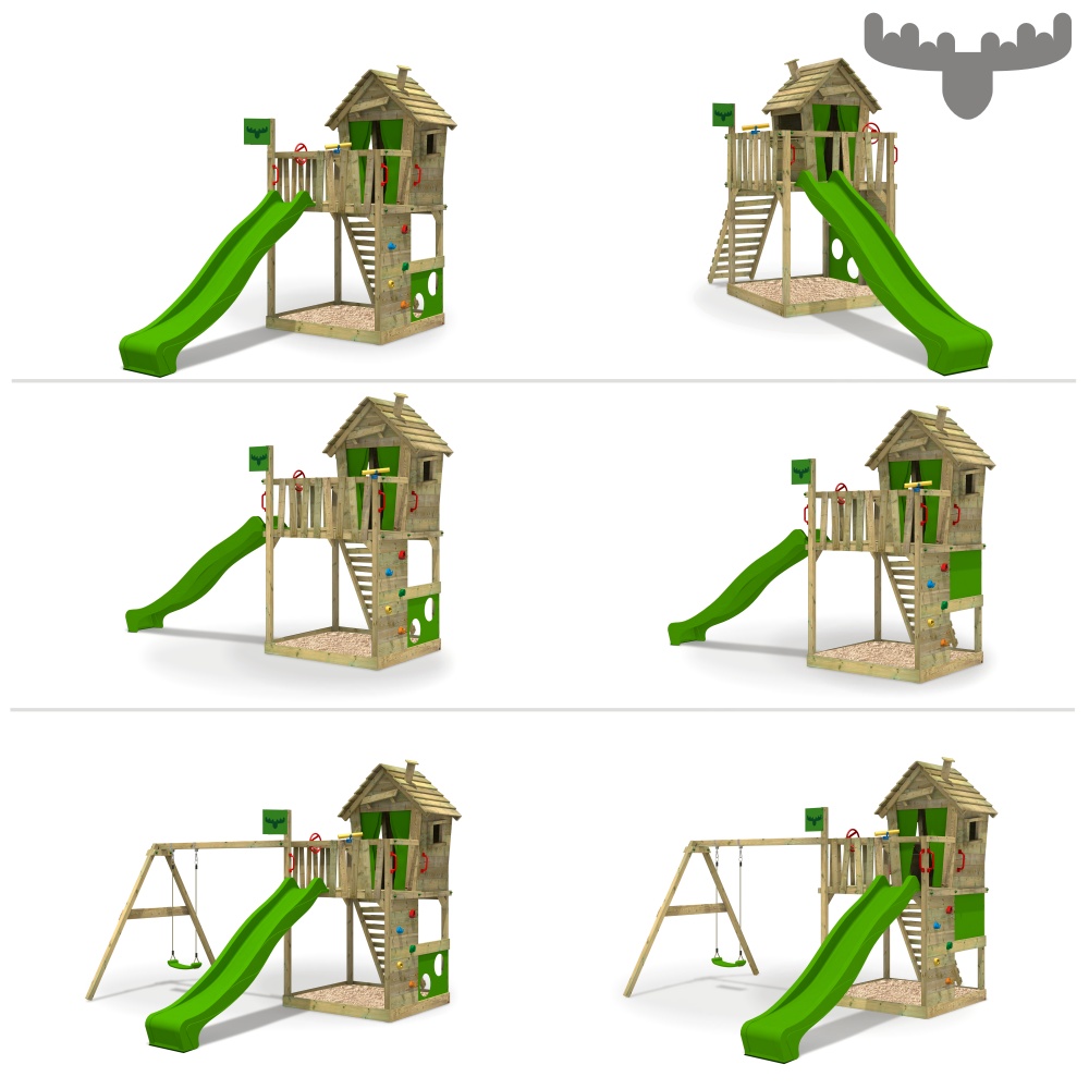 Special Features: Lustiges, schräges Design in knalligen Farben Verschiedene Aufstellmöglichkeiten Wellenrutsche mit Wasseranschluss Versteckspiel im Spielhaus möglich Theke im Spielhaus für Ladengeschäft, Hotel, Eisdiele oder Kasperle-Theater Unterschiedliche Leitervarianten für optimales Motoriktraining Pflegeleichtes, imprägniertes Massivholz (Anstrich nicht nötig) Alle nötigen Befestigungsmittel verzinkt und von deutscher Qualität Zweiteilige Sicherheitskappen Allwetter FATMOOSE Planen und Fahne sehr stabil (650gr/m²) Plane abwaschbar und zum Bemalen Umrandungsbretter schräg oder gerade montierbar Sehr ausführliche Montageanleitung für den einfachen Zusammenbau Bei Bestellung ohne Rutsche: Bretter zum Schließen der vorderen Öffnung inklusive