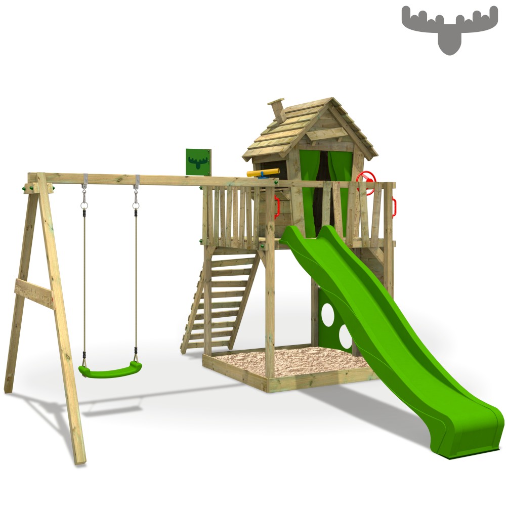 Lieferumfang: XXL Spielturm mit Podesthöhe 150cm Wellenrutsche MegaGlider XXL hellgrün Schräges Baumhaus auf Podest mit 1 Fenster Ladentheke im Baumhaus StreetPilot Rennlenker Fernrohr SpecialSpy Kletterwand gerade Kletterleiter schräg 4 Sicherheitshandgriffe Integrierter XXL Sandkasten 2 wetterfeste FATMOOSE-Sticker Spielhaustür aus Allwetterplane Torwand aus Allwetter Plane Allwetter FATMOOSE Fahne