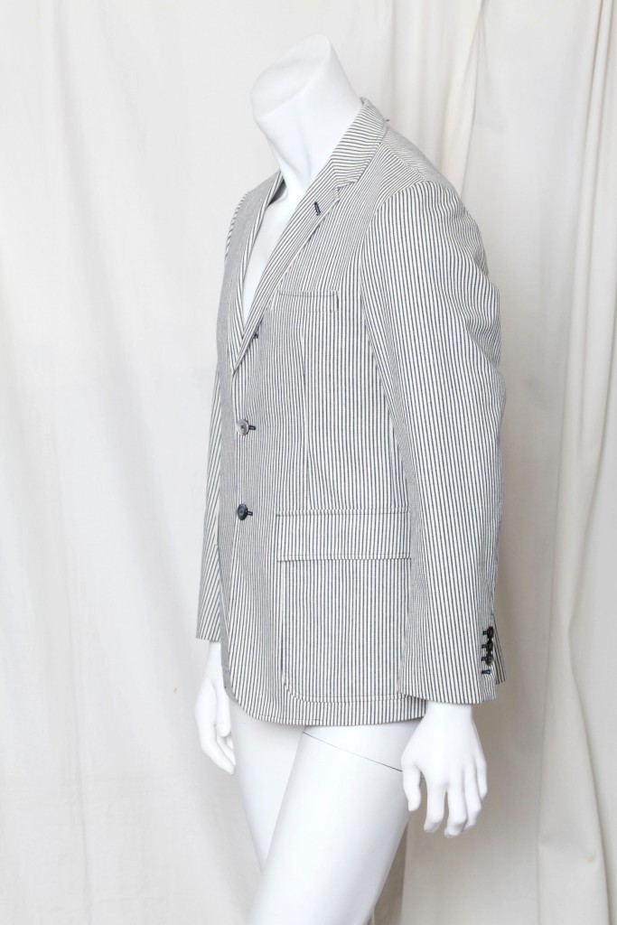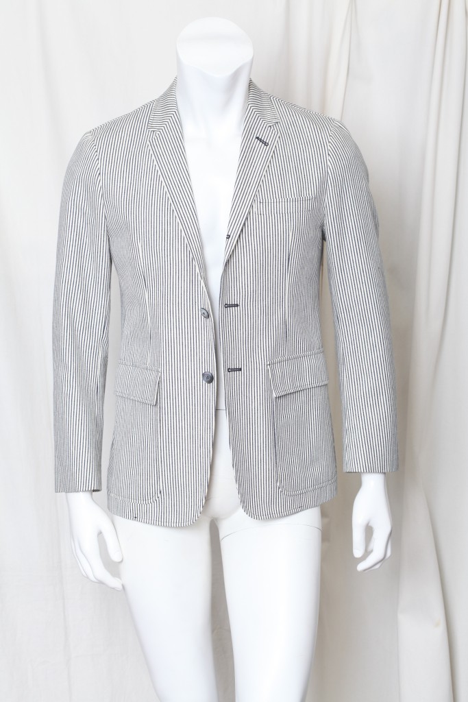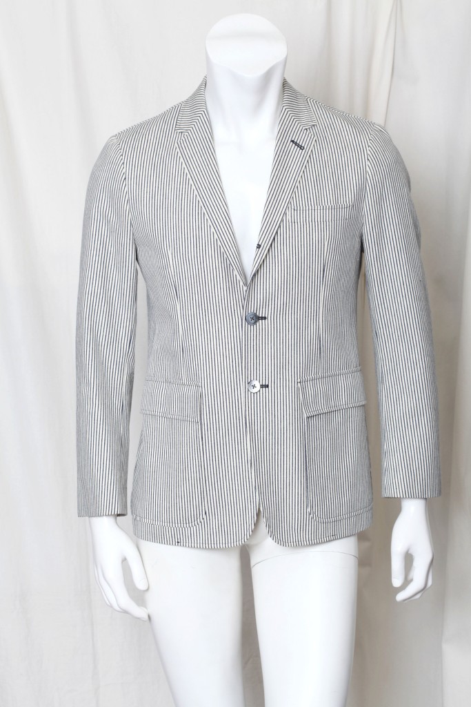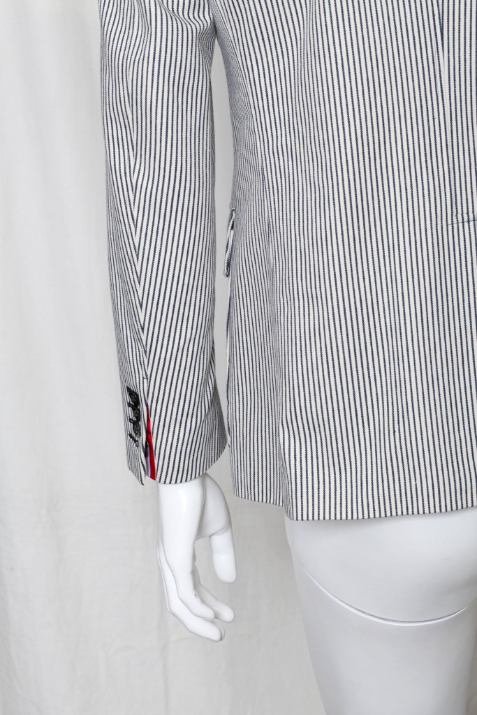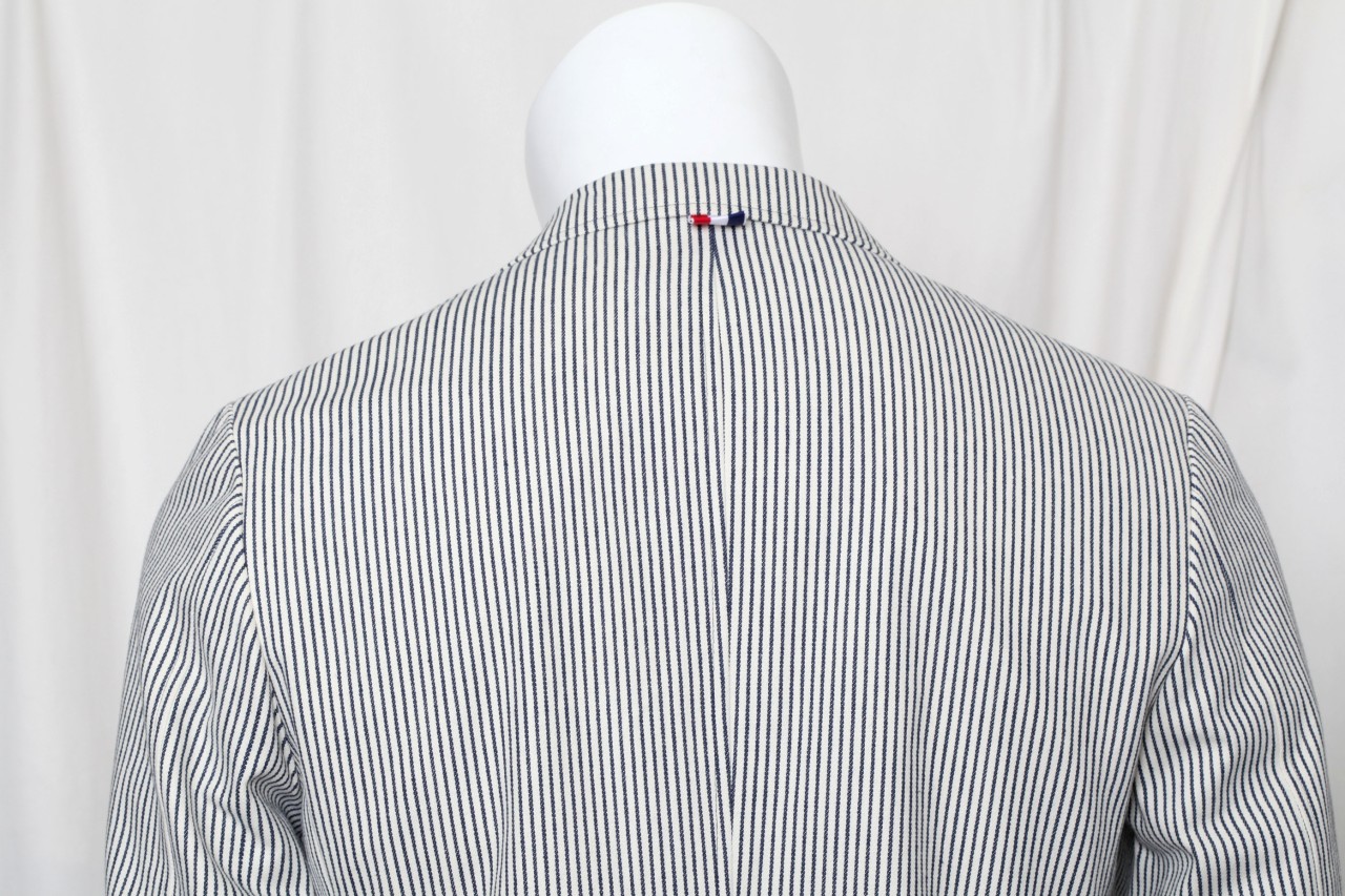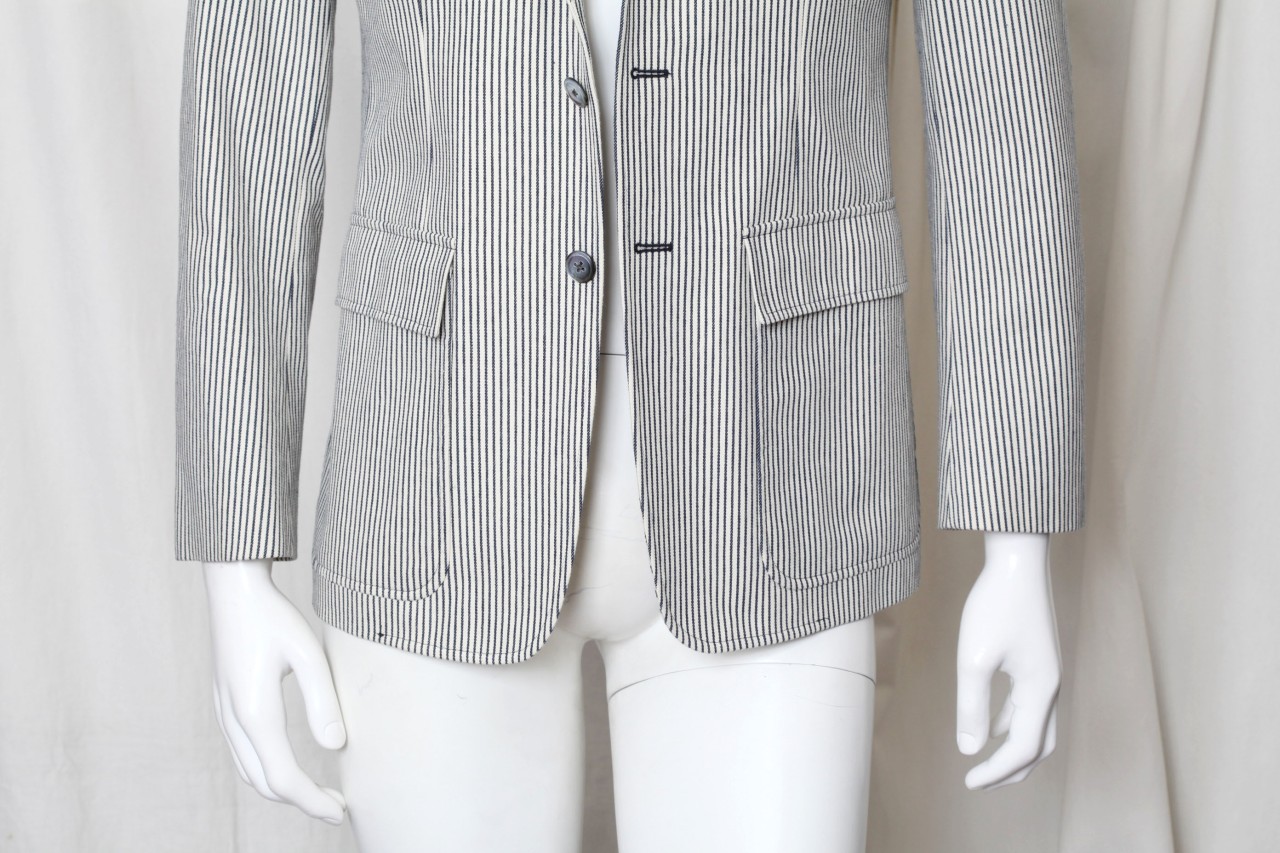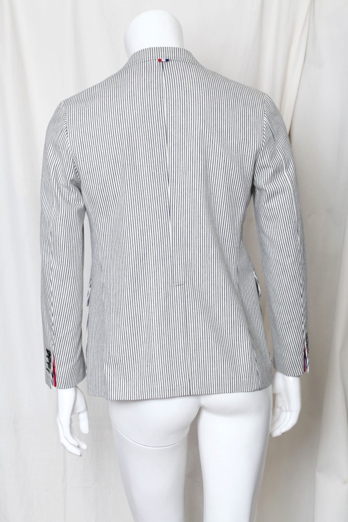 Impeccably stylish Thom Browne blazer in a black and white cotton stripe, with an almost denim feel. Feels dapper yet casual at the same time! Medium weight, lined everywhere but center back, and comes with a package of extra buttons. Designer Name: Thom Browne Made In: Japan Condition: New without tags; tried on here in our showroom. Color: Black and Off White Content: Cotton Designer Size: Marked a 1, or approx a size 38 # Of Vents: Single vent still sewn closed # Of Buttons: 3 Fully Lined Jacket measurements (laying flat): Chest (armpit to armpit x 2): 40.5" Waist: 37.5" Length (top of shoulder to bottom of hem): 29" Shoulder to shoulder: 16 & 3/4" Sleeve length (shoulder seam to sleeve end): 24.5" Item#: 218-317-8h/1k-vh-0112