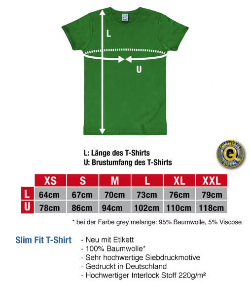 Das T-Shirt ist schlank geschnitten und lässt sich sehr gut kombinieren. Durch den hochwertigen Siebdruck und die Einlaufvorbehandlung bleibt das Slim Fit T-Shirt auch nach mehreren Wäschen formstabil. Das T-Shirt ist aus 100% Baumwolle hergestellt. Es handelt sich um eine besonders hohe Materialqualität (230 g/m2). Die Marke Logoshirt steht für authentisches Design, für hohe Qualität und für Originalität. Es werden ausschließlich lizenzierte Originaldesigns verwendet. Weitere Artikel im Logoshirt-Shop ![]() Länge und Brustumfang des T-Shirts nach Größe ![]() Zahlungsarten, Versand und Umtausch oder Rückgabe ![]() |