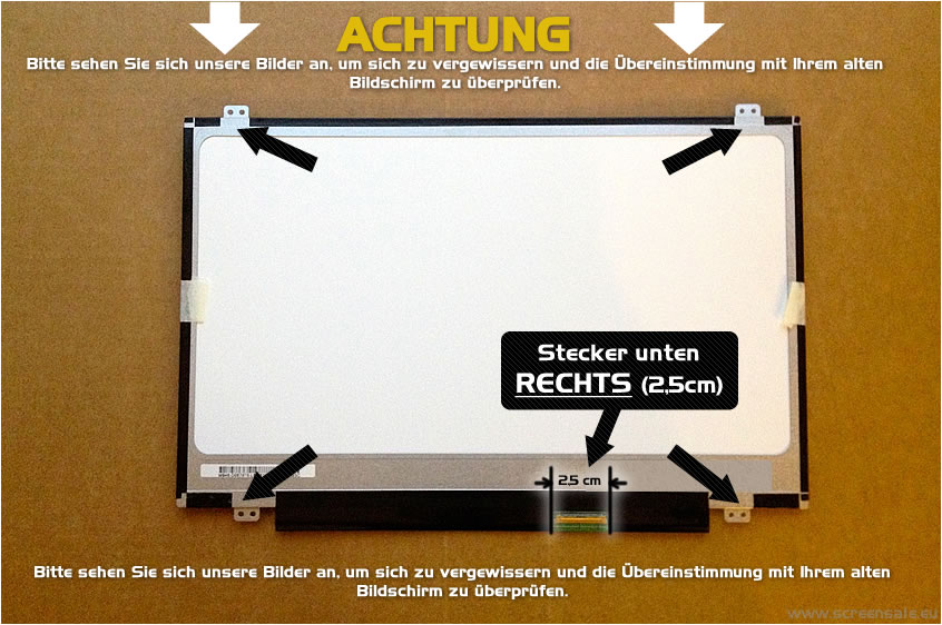 Produktinformationen. Dies ist ein neuer Originalbildschirm (Stecker unten RECHTS) zum Ersetzen Ihres beschädigten Bildschirms. Bitte sehen Sie sich unsere Bilder an, um sich zu vergewissern und die Übereinstimmung mit Ihrem alten Bildschirm zu überprüfen. Sollten Sie sich nicht sicher sein, dass dies der richtige Bildschirm für Ihren Laptop ist, oder Sie brauchen ein Bildschirm wo der Stecker unten rechts liegt, bitte treten Sie mit uns in Kontakt. Schreibens Sie uns einfach an und ein freundlicher Mittarbeiter wird Ihre Frage schnell beantworten. Wir bearbeiten Emails täglich.Unsere Kundenbetreuung arbeitet am Werktagen.
