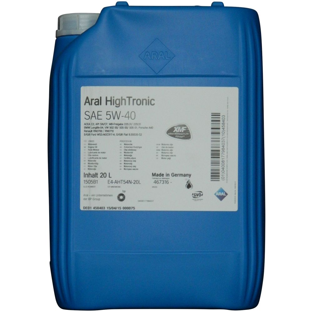 wochentags 8-17 Uhr Aral HighTronic 5W-40Aral HighTronic 5W-40 ist ein Hochleistungs-Leichtlaufmotorenöl in Aral- Synthese-Technologie mit breitem Einsatzspektrum. Die ausgewogene Formulierung erfüllt auch die hohen Verschleißanforderungen nach VW 505 01 (Pumpe-Düse Spezifikation) und anderer Hersteller. Auch für Benzinmotoren geeignet (Herstellerspezifikationen beachten). Das Motorenöl bietet auch ein Kraftstoffeinsparpotential und trägt somit zur Schonung der Umwelt bei. VorteileHervorragend geeignet für den LPG- & CNG-Betrieb - bitte Herstellervorgaben beachten! Spezifikationen