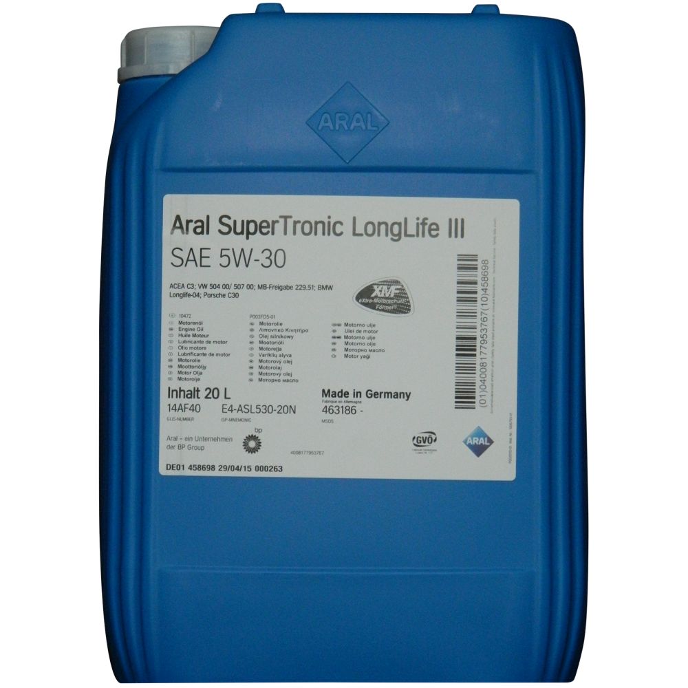 wochentags 8-17 Uhr Aral SuperTronic LongLife 3 III 5W-30Aral SuperTronic LongLife III ist ein kraftstoffsparendes Leichtlaufmotorenöl in Aral-Synthese-Technologie. Die aschearme Formulierung (low SAPS) verlängert die Lebensdauer des Dieselpartikelfilters durch eine verminderte Konzentration an aschebildenden Partikeln im Abgas. Aral SuperTronic LongLife III wurde in Zusammenarbeit mit dem VAG Konzern entwickelt und kann in nahezu allen VW, Audi, SEAT und Skoda Fahrzeugen mit flexiblem Wartungsintervall eingesetzt werden. Bis auf wenige Ausnahmen (R5 Diesel und V10 TDI) kann das Öl auch in älteren Fahrzeugen mit starrem Wartungsintervall eingesetzt werden. Außerdem kann das Produkt auch in vielen BMW und Mercedes Pkw eingesetzt werden, so dass die Sortenvielfalt in den Werkstätten minimiert werden kann. Vorteile von Aral SuperTronic LongLife III 5W-30 20 Liter