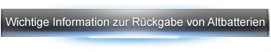 Batterien dürfen nicht in den Hausmüll gegeben werden. Durch das Mülleimersymbol werden schadstoffhaltige Batterien gekennzeichnet sowie der Umstand, dass Batterien nicht über den Hausmüll sondern fachgerecht entsorgt werden müssen. Endnutzer sind zur Rückgabe von Altbatterien gesetzlich verpflichtet. Wir haben Sie darauf hinzuweisen, dass Batterien nach Gebrauch an uns unentgeltlich zurückgegeben werden können. Sie können daher Altbatterien zur fachgerechten Entsorgung an uns übersenden:
