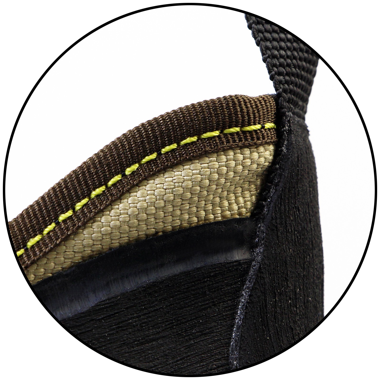 Zusätzlich besitzt er eine Anziehschlaufe, die hinten am Fersenteil befestigt ist und so ein leichteres An- und Ausziehen des Schuhes ermöglicht. Im Inneren ist der Kletterschuh mit einer dünnen Futterschicht ausgestattet, die dazu dient, den Schweiß aufzunehmen und dadurch den Tragekomfort wesentlich erhöht.