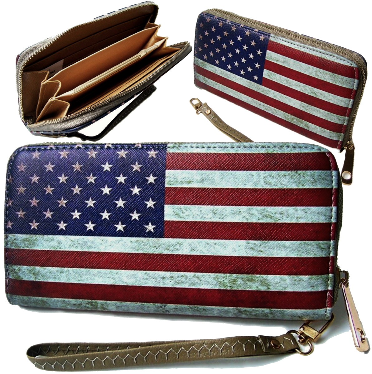 Produktbeschreibung Geldbörse/Clutch Damen: Design: Flaggenprint USA- oder England, Maße: ca. 20 x 10 x 2,5cm mit einem Hauptfach, 20x10x5cm mit 2 Hauptfächern Material: bedrucktes Kunstleder im used-look, beiges Innenfutter Rundum-Zipper-Reißverschluss mit abnehmbarem Tragehenkel Hauptfach Innen mit Reißverschlußtasche, seitlichen Steckfächern, Kartenfächern und 3 Fächer z.B. für Geldscheine, Handy oder sonstige Dinge die FRAU braucht
