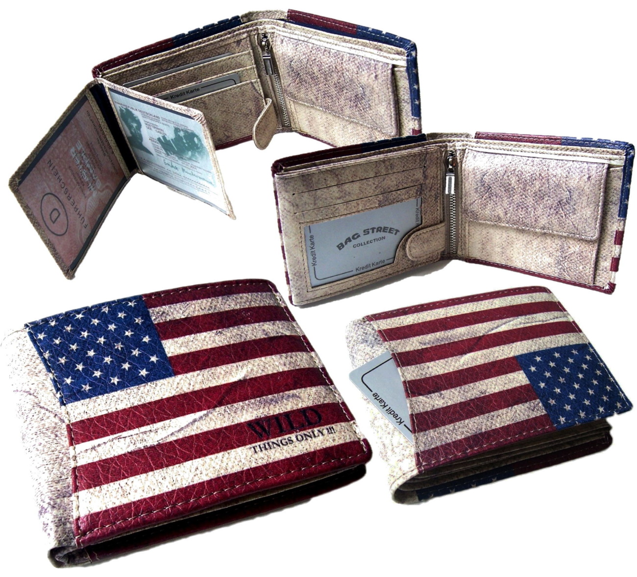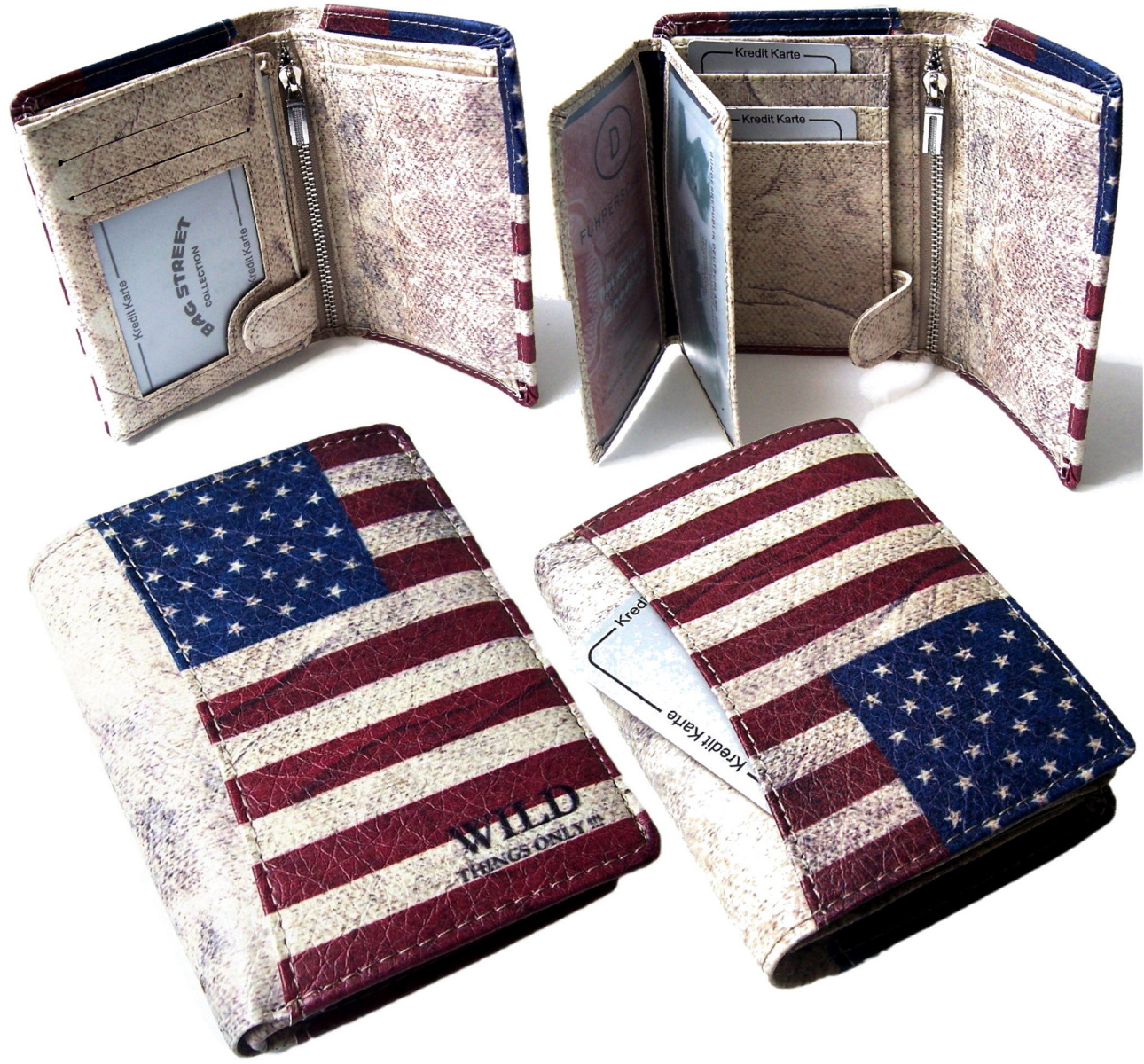 Produktbeschreibung Geldbörse USA-unisex: Design: Geldbörse im Hoch- oder Querformat Maße: ca. 12 x 9 cm, Marke: Bag Street Material: bedrucktes Kunstleder im used-look mit hellen Steppnähten, dunkelblaues Innenfutter, 1 Fach für Münzen mit Druckknopfverschluss und 1 zusätzliches Fach mit Reißverschluss, 7 oder 8 Kartenfächer, 1 Karten-Klarsichtfach, 2 Ausweis-Klarsichtfächer, 2 Seitenfächer, 1 Sicherheitsbügel mit Druckknopf für Kartenteil