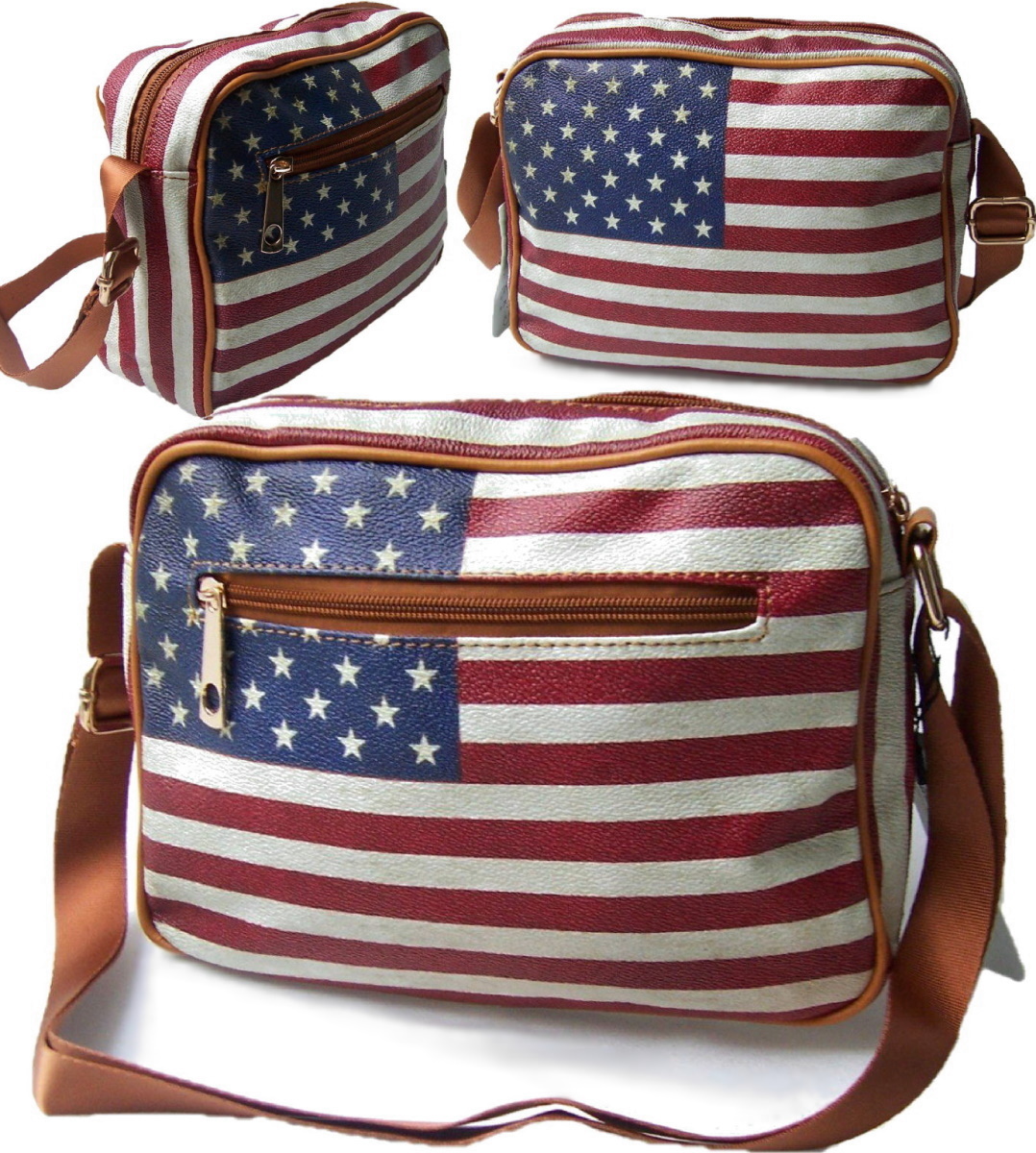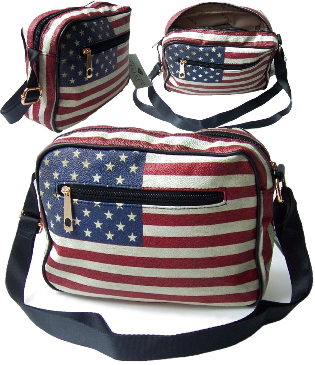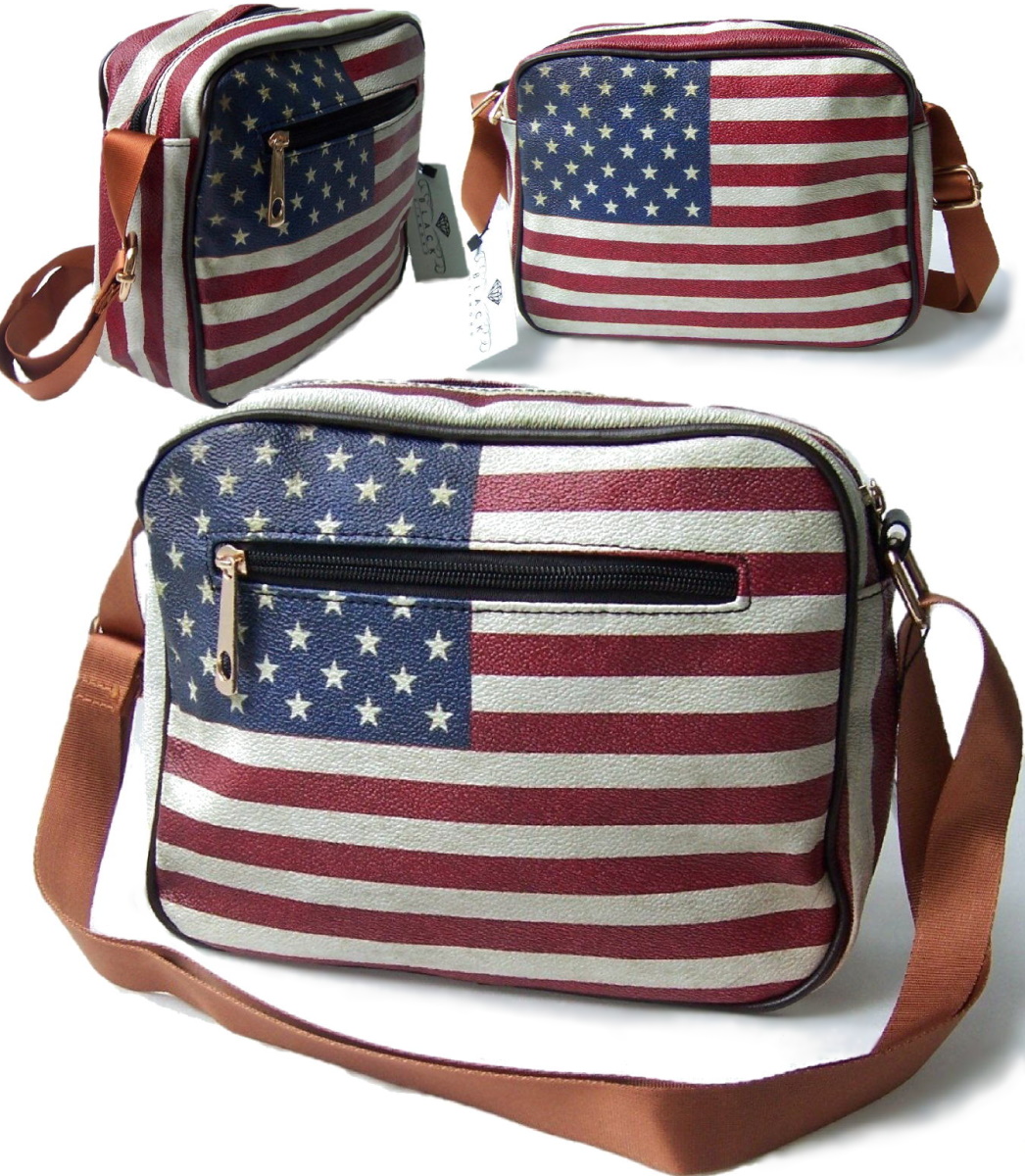 Produktbeschreibung Umhängetasche: Design: Messenger -Reporter-Tasche unisex, Maße: ca. 25 x 18 x 8 cm Material: bedrucktes Kunstleder im used-look USA-Flagge mit beigem Innenfutter, 1 Hauptfach mit Zipper-Reißverschluß 1 Fach auf der Vorderseite mit Reißverschluß, 1 Steckfach und 1 Einschubfach fürs Handy, Tragegurt verstellbar von 65-125cm Öse und Zipper in gold