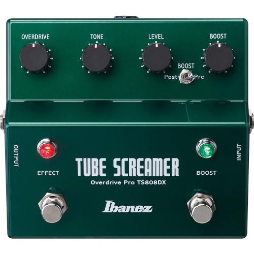 Ibanez TS808 DX Tube Screamer Overdrive Pro Die Ibanez TS808 Tube Screamer Overdrive Pro ist ein Verzerrer-Pedal für Gitarren. Seit über 30 Jahren ist die Ibanez TS808 Tube Screamer ist eines der beliebtesten Overdrive-Pedale in der Gitarristen-Szene. Jetzt hat Ibanez seinen Klassiker erneuert und einige frische Funktionen spendiert. So sorgt jetzt ein Booster für mehr Lautstärke und Durchsetzungsfähigkeit im Overdrive-Betrieb. Das Ibanez TS808 Tube Screamer Overdrive Pro-Pedal verfügt weiterhin über zwei unabhängige True-Bypass-Kanäle, wodurch Booster und Overdrive entweder separat oder miteinander gekoppelt verwendet werden. Sie können den bis zu 20 dB kräftigen Booster vor oder nach dem Verzerrer schalten, was dem Gitarristen ganz neue klangliche Gestaltungsmöglichkeiten erlaubt. Features: