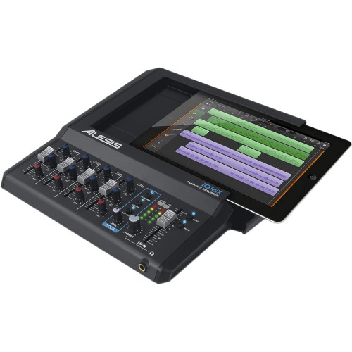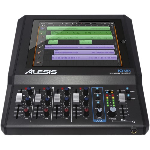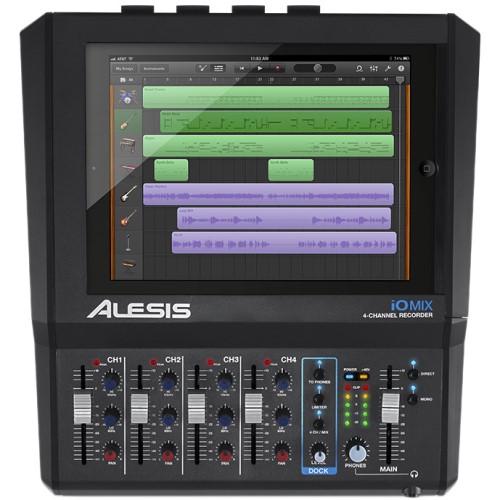 Alesis iO Mix Alesis iO Mix ist ein iPad Mischpult/Recorder/Audio Interface. Alesis iO Mix verwandelt das iPad in ein leistungsfähiges, mobiles Studio mit integriertem 4-Kanal Audiointerface. Mit dem Alesis iO Mix können mehrere Instrumente oder Mikrofonsignale gleichzeitig in GarageBand oder anderen Core Audio fähigen Apps aufgezeichnet werden. Dazu wird das iPad einfach in die Halterung geschoben, mit dem 30-Pin oder Lightning Adapter verbunden und die Verschlussklappe geschlossen. Jetzt ist das iPad startklar und bietet nahezu unbegrenzten Zugriff auf kompatible Core Audio Applikationen wie etwa Garage Band. Über den kompakten 4-Kanal Mixer lassen sich die Signalquellen für die Aufnahme vorbereiten. Hierzu steht neben einem 2-Band EQ ein Lautstärke- und ein Panoramaregler zur Verfügung. Mehrfarbige LED-Meter helfen dabei, den besten Aufnahmepegel zu finden, ein zuschaltbarer Limiter verhindert Übersteuerungen. Das Interface bietet eine Vielzahl an Anschlüssen, die für die Aufnahme einer Band oder eines Projekts benötigt werden: vier XLR-/Klinkeneingänge, Phantomspannung, Limiter und symmetrische Stereoausgänge. Die Lautstärke des zusätzlichen Kopfhörerausgangs kann separat eingestellt werden, Direct Monitoring ist per Schalter aktivierbar. Features: