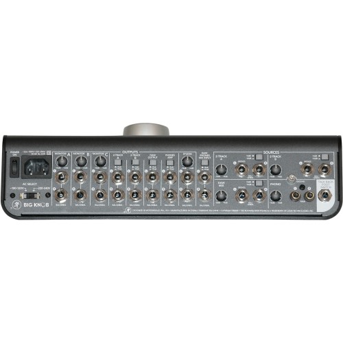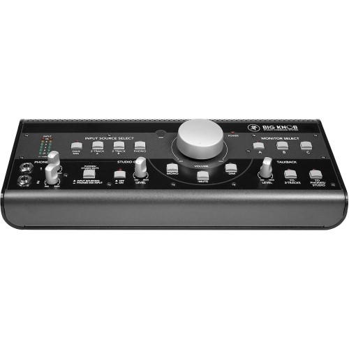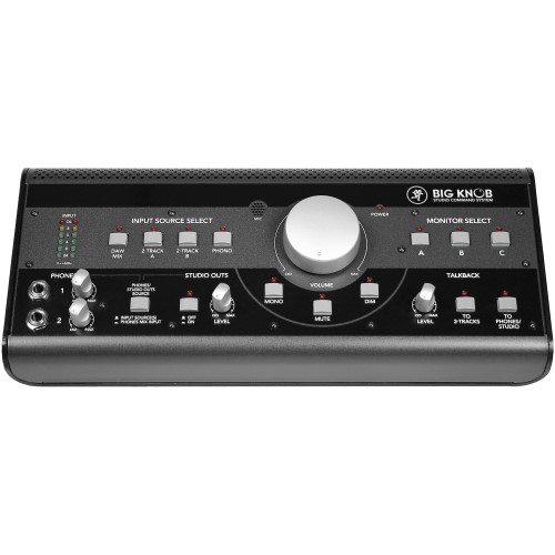 Mackie Big Knob Seit den Anfängen der computer–basierten Musikproduktion warten alle Beteiligten auf eine einfache Box zur Monitorumschaltung und Pegelsteuerung mit integrierten Talkback–Funktionen. So ein kleines Gerät auf dem Schreibtisch, mit dem man einfach zwischen Studiomonitor–Sets und verschiedenen Stereo–Quellen umschalten kann. Und Musikern ihre persönliche Kopfhörermischung erstellen kann, während man über ein integriertes Talkback–Mikrofon mit ihnen kommuniziert. Ihr Wunsch ist uns Befehl... Der Big Knob ist ein einfaches, aber leistungsfähiges Desktop Audio Control Center, mit dem Musiker und Techniker auf vier Hauptwegen direkt zur Musikproduktion gelangen: Pegel–Steuerung, Studiomonitor–Wahl, Eingangsquellen–Wahl sowie Talkback & Kopfhörer–Steuerung. Beim Big Knob können Sie mit einem großen, praktischen Pegelregler die Lautstärke so wie unsere Audio–Vorväter (Analogus Ingenörus) einstellen – mit einem einfachen, intuitiven Drehknopf und nicht mit Maus und Bildschirm. Dies resultiert in höherer Präzision und wesentlich schnellerer Pegeleinstellung. Profis wissen, dass man beim Mischen lieber eine zweite und dritte Meinung einholen sollte. Also ermöglicht der Big Knob das schnelle Umschalten zwischen 3 Paaren von Studiomonitoren oder 2 Studiomonitoren und einem Subwoofer oder Studiomonitoren und einer Heim–Stereoanlage oder jeder anderen Kombination von Aktivlautsprechern. Eingangsseitig lassen sich beim Big Knob bis zu 4 Stereo–Eingangsquellen gleichzeitig anschließen. Dies können die Ausgänge eines Computers/DAW, CD Players, Cassettendecks und – dank dem erstklassigen integrierten RIAA Preamp – sogar Schallplattenspielers sein. Es lassen sich auch Keyboards, Gitarren, Drum Machines und Sampler anschließen – alles, was Sie über die Monitore hören möchten. Der Big Knob eignet sich deshalb ideal zum Vergleichen einer aktuellen Mischung mit einer Lieblings–CD oder zum Archivieren von alten LPs oder zum Jammen zu einem Lieblingssong oder oder oder... Dank dem integrierten Talkback–Mikrofon und den nicht–rastenden Aktivierungsschaltern lässt Big Knob Sie schnell mit den Musikern im Studio und im Tracking–Raum kommunizieren – Handzeichen durch die Glasscheibe werden überflüssig! Big Knob zeichnet sich auch durch zwei leistungsstarke Kopfhörer–Ausgänge mit getrenntem Kopfhörer–Mixbus aus und löst damit die Kommunikationsanforderungen der meisten computer–basierten Studios. Obwohl der silbrig glänzende Drehknopf die Aufmerksamkeit auf sich zieht, ist auch das rückseitige Big Knob–Bedienfeld beeindruckend. Dort befinden sich drei getrennte Monitor–Ausgänge mit individueller Pegelregelung, 2–Spur A und 2–Spur B Stereo–Ausgänge mit Pegel–Wahlschaltern, ein DAW Stereo–Ausgang für Ihren Computer, ein Studio–Ausgang mit Pegelregler, ein Phones Mix–Eingang mit Pegel–Wahlschalter, 2–Spur A und 2–Spur B Stereo–Quelleneingänge mit Pegelregler, ein DAW Mix–Eingang von Ihrem Computer mit Pegelregler, und sogar ein Phono–Eingang mit Pegelregler für den direkten Anschluss Ihres Schallplattenspielers. Da Big Knob eine wichtige Verbindung zwischen den Aufnahme–Ausgängen und Studiomonitoren darstellt, legten wir allergrößten Wert auf makel– und kompromisslose Klangqualität. Aus diesem Grund zeichnet sich Big Knob durch absolut rauscharme OP–Amps, extrem toleranzarme Bauteile und modernste Oberflächenmontage–Technologie aus. Damit sind exzellenter Sound in entscheidenden Abhörumgebungen und langfristige Zuverlässigkeit garantiert – sogar im täglichen und nächtlichen Studio–Einsatz. Features: