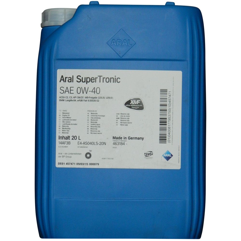 wochentags 8-17 Uhr Aral SuperTronic 0W-40Aral SuperTronic SAE 0W-40 ist ein vollsynthetisches Hochleistungs-Motorenöl für für PKW - Otto- und Dieselmotorenmit hohem Kraftstoff-Einsparungspotential. Aral SuperTronic SAE 0W-40 bietet Ihnen· Sicherheit für ihren Motor bei unverändert langen Ölwechselintervallen· Aral Low SAPS-Technology für maximale Lebensdauer des Dieselpartikelfilters. SpezifikationenACEA C2, C3