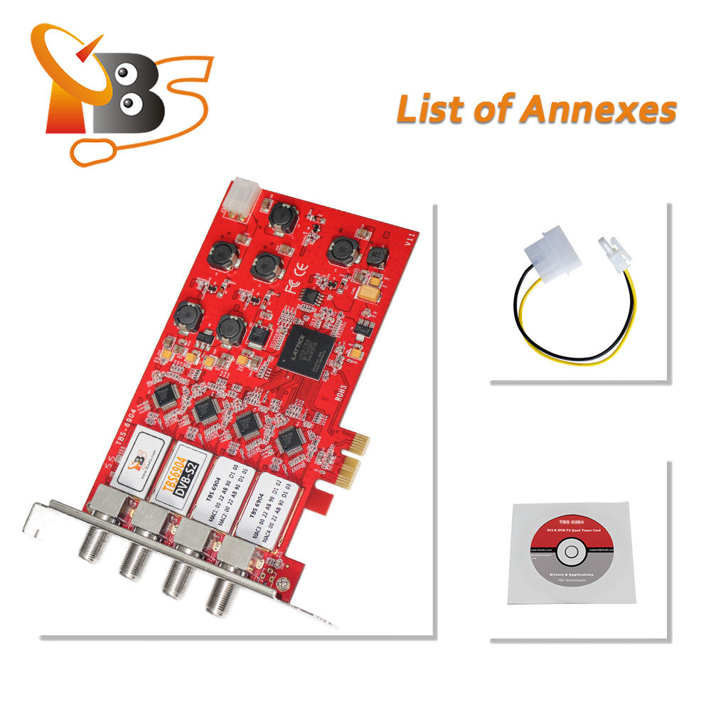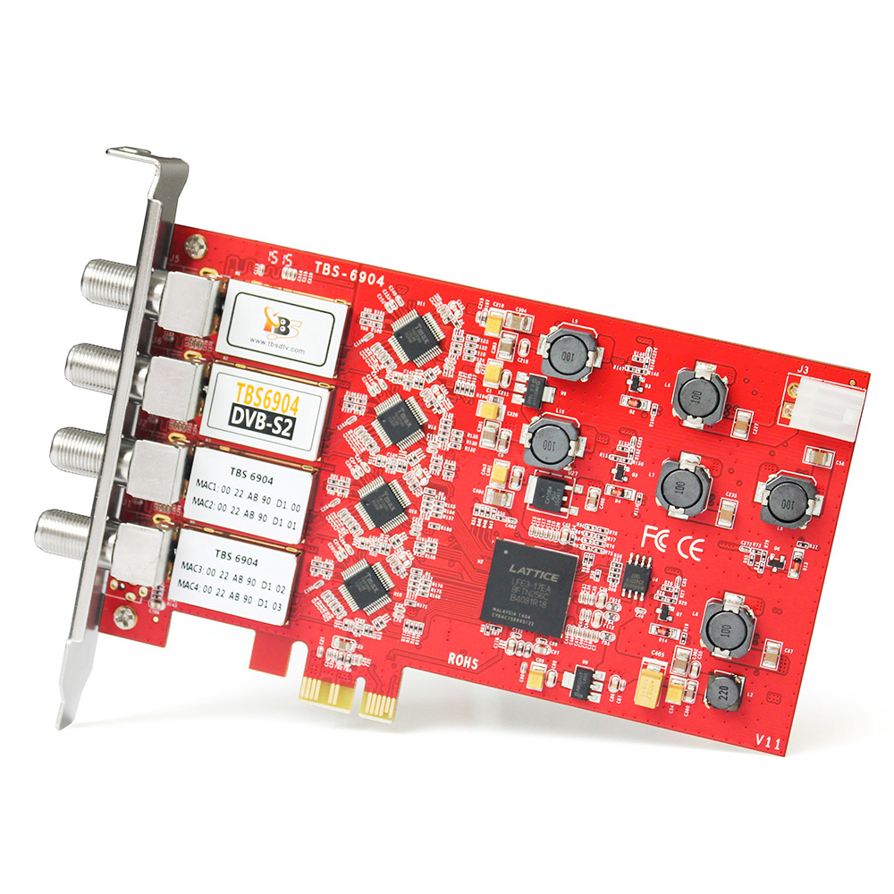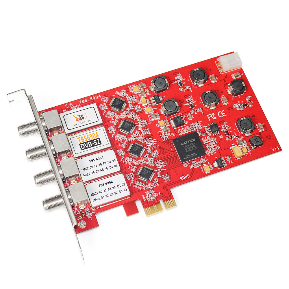 TBS6904 is a PCI Express interface digital satellite TV tuner card with four tuners for watching and recording Free to Air (FTA) satellite TV on PC. The four advanced DVB-S2/S tuners enable you to watch TV channel from one satellite transponder, while recording three other channels from different satellite transponders at the same time. This quad tuner card is one of the most popular TV tuners for building IPTV streaming systems.