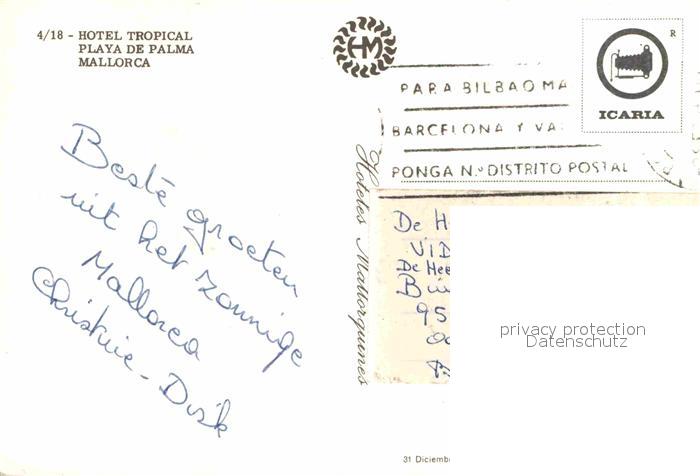 Playa de Palma Mallorca Hotel Tropical Spanien postalisch gelaufen nach 1965 Erhaltung siehe scans [LiesaD40] LiesID40