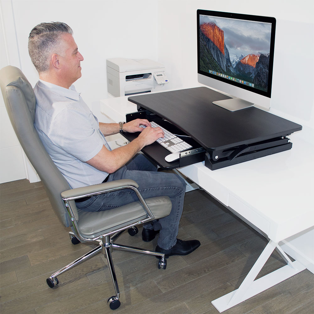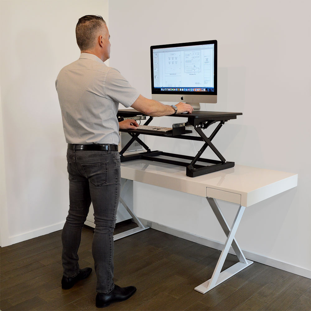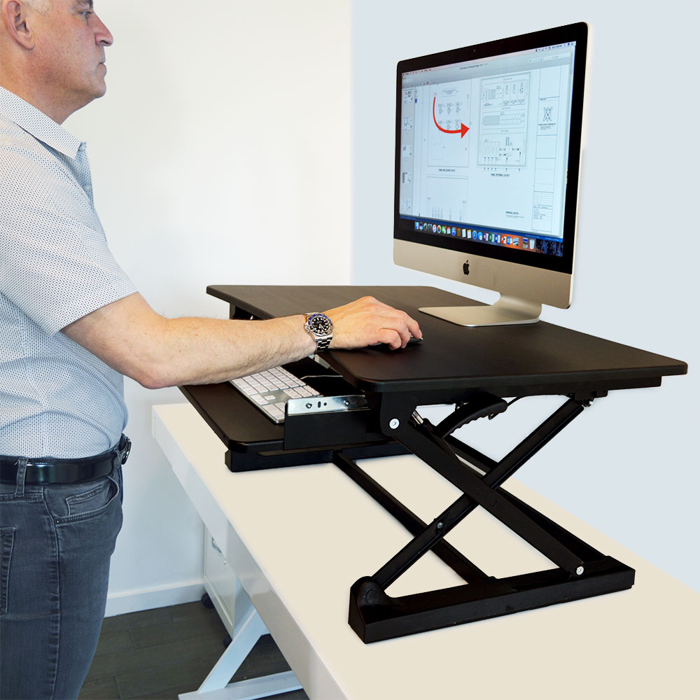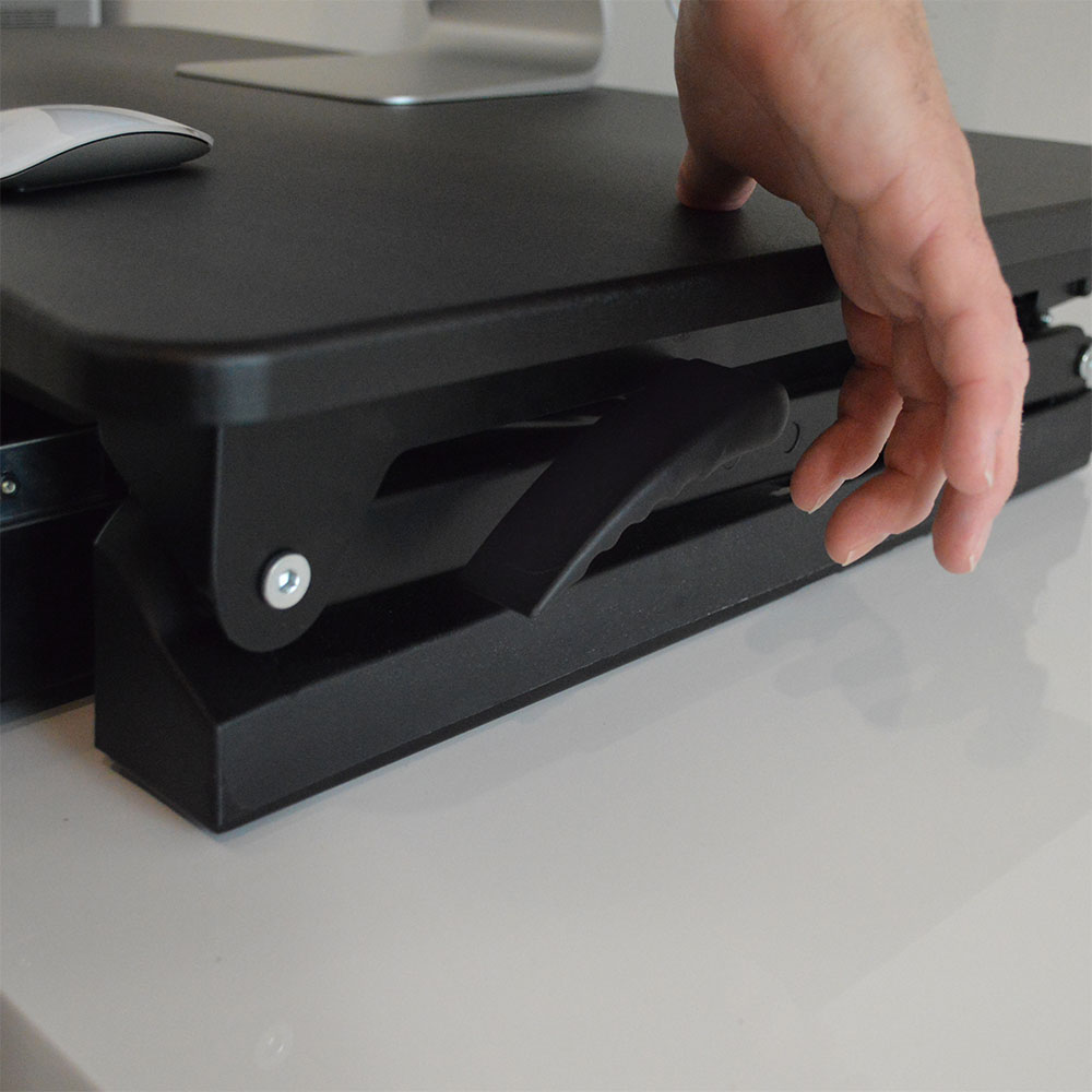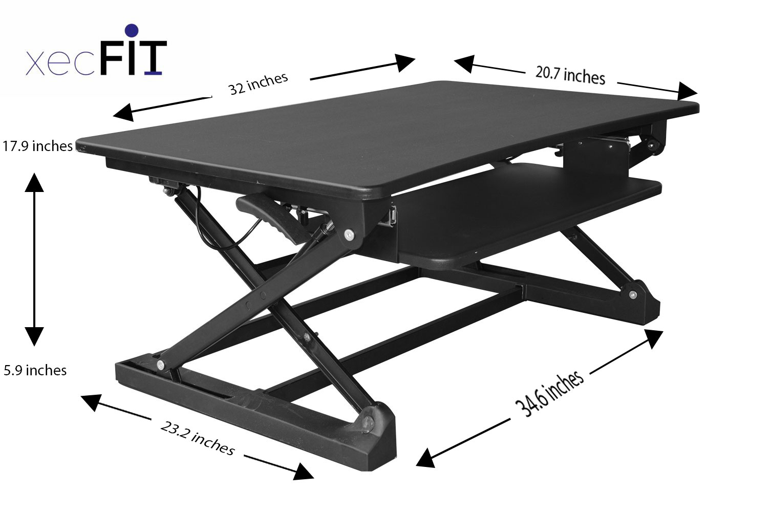 DETAILS AND SPECIFICATIONS It has been said that sitting is the new smoking, but with the xec-FIT Adjustable Height Convertible Sit to Stand Up Desk Laptop Desktop Riser you'll be able to curb your habit and get back to the grind! The desk features a dual gas spring force that allows you to easily transition between sitting and standing. You can conveniently raise and then lower the desk from 5.9 to 17.9-inches. To sit, simply squeeze handles on each side for easy lifting and lowering. This height adjustable dual-tiered platform sits directly on top of your current desk and gives you the easy convenience of standing or sitting. This standing desk also provides added work space for you so that you can perform at the highest level. Customize your work area and create the work flow you need to get the job done. For more space, the lower tier perfectly fits a keyboard and mouse. Being able to stand during your daily work routine will provide several health benefits, including, increased blood flow, enhanced posture, and increased focus. The easy to assemble xec-FIT Adjustable Height Convertible Sit to Stand Up Desk Laptop Desktop Riser will put you on the fast-track to success. Features