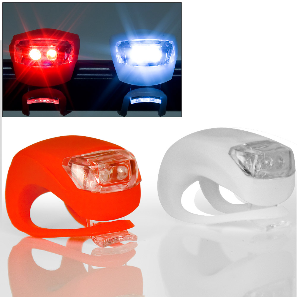 Das Silikon Lampen-Set besteht aus einem roten Rücklicht und einem weißen Frontlicht. Beide Lampen sind mit je 2 lichtstarken LEDs ausgestattet.