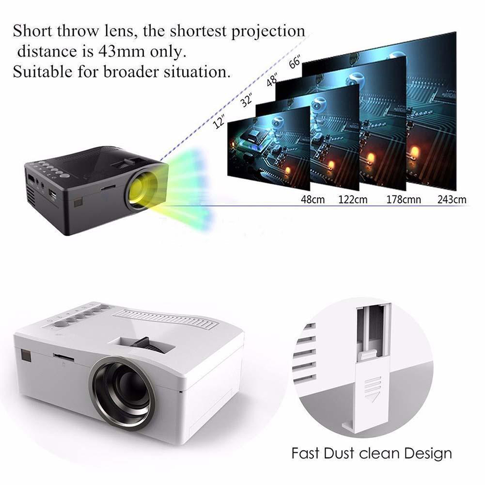 Specifications: Model: UC18 Material: ABS Size: 117.5*86.3*42mm Color: White Battery: Projector: 1000mAh/7.4V; Remote: CR2025L Adapter: Input: 100-240V/0.5A, Output: 12V/1.5A, Can charged by 5V/2A cellphone charger. Lens: F=60 Resolution: 320*180 Support 1080P video Portable: Yes Style: LCD Use: Business & Education,Home,Engineering Home Theater Projector: Yes Type: Digital Projector Projection Distance: 48-243cm is Pocket Projector: Yes Lamp: LED Brightness: 800Lumens Contrast Ratio: 500:1 Image Scale: 16:9 Image Size: 10 - 60 inch Certificate: CE, FCC, RoHS Picture Formats: JEPG, BMP, PNG Audio Formats: WMA, MP3, M4A Video Formats: MPEG, AVI, MP4, RMVB, FLV, VOB, MOV, 3GP etc Input: USB, TF, HDMI, AV(3 in 1)