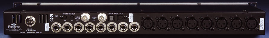 The eight line-level inputs and outputs are balanced, where the line inputs are on the front panel, the XLR mic inputs on the rear panel, and the analogue line output jacks are also on the rear panel. Rear-panel digital connections comprise a pair of ADAT optical ports (input and output) plus word-clock inputs and outputs on standard BNC connectors, though these are only available when the digital card is fitted. Power comes from an external supply coupled via a locking connector.