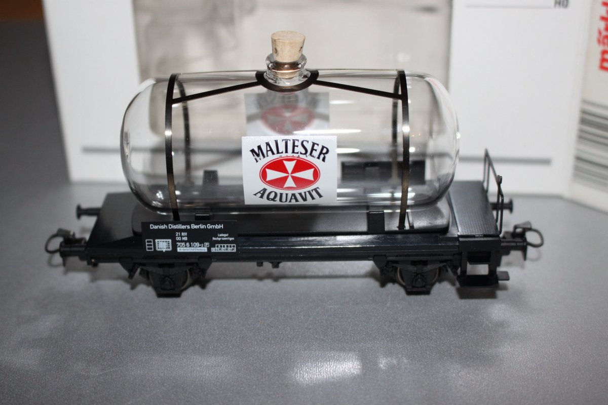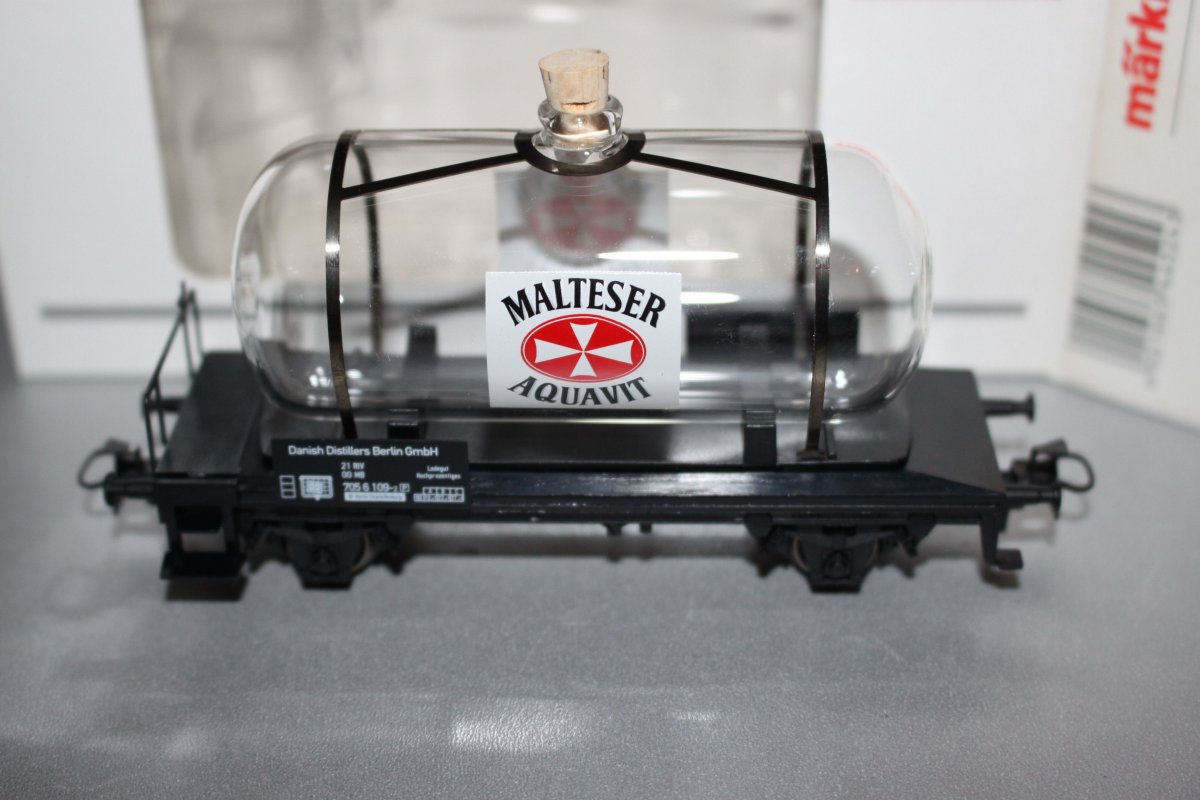Es ist ein Märklin 44524 2-Achser Glaskesselwagen Malteser Aquavit Spur H0 in OVP.