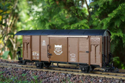 gedeckter Güterwagen, braun mit LGB baugleichen Kupplungen. Ähnliche Wagen wurden von der Rhätischen Bahn eingesetzt.