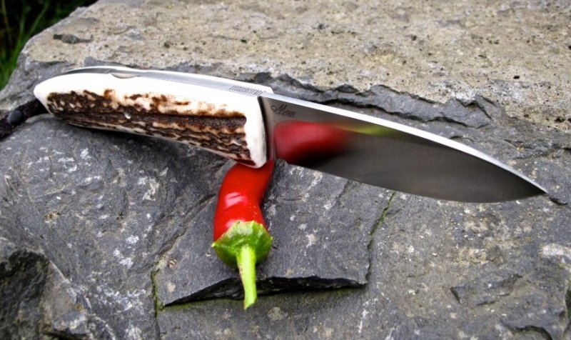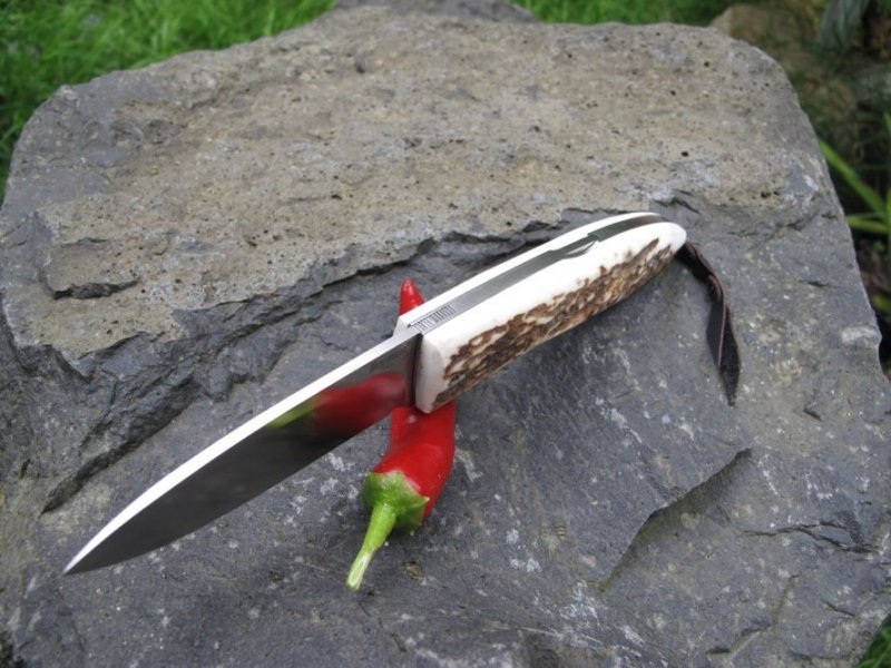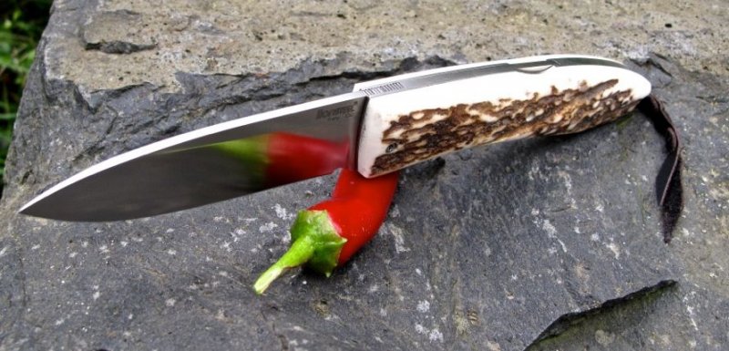 Technische Daten: Gesamtlänge: 17,7 cm Klingenlänge: 7,4 cm Grifflänge: 10,3 cm Klingenstärke: 3 mm Klingenstahl: D2 Hochleistungs Werkzeugstahl Klingenarretierung: Klassischer Back Lock Öffnung: Klassischer Nagelhieb (Kein Einhandmesser) Gewicht: 132 g Griffschalen: Hirschhorn Inklusive Leder Etui Insgesamt ist dieses Messer absolut präzise verarbeitet. Hier kann sich manch deutscher Hersteller eine Scheibe von abschneiden. Ein traumhaftes Gesamt Finnisch. Das Messer liegt sehr gut in der Hand und ist in der Tasche kaum zu spüren.