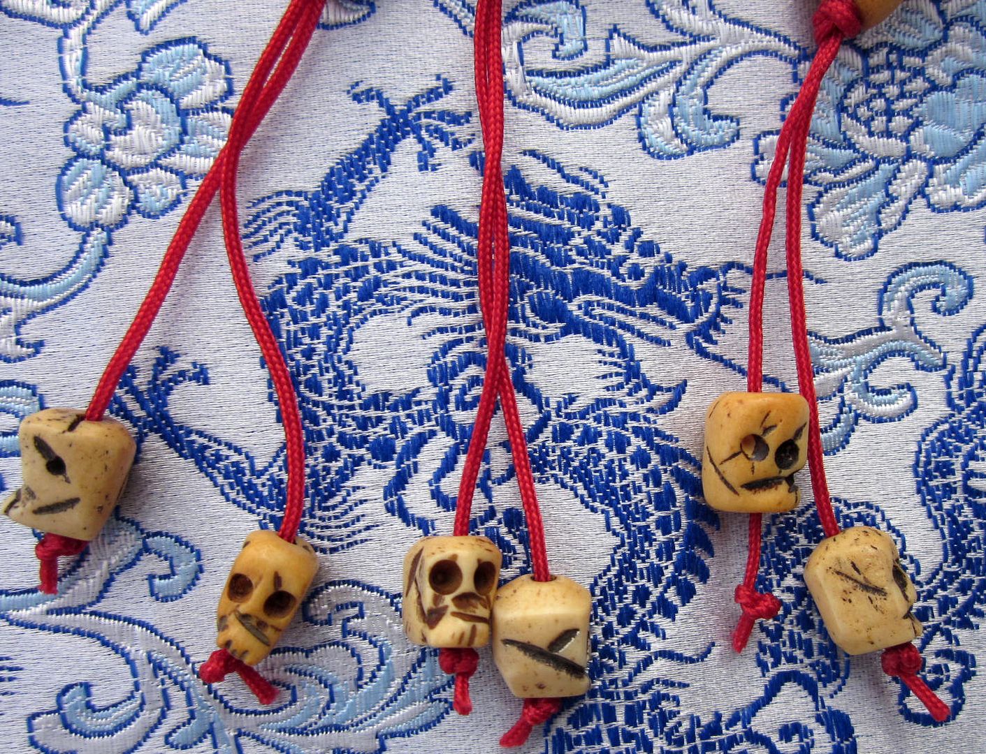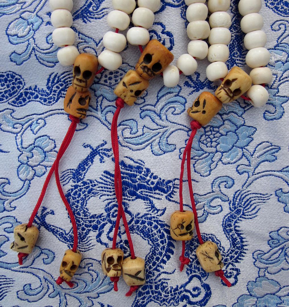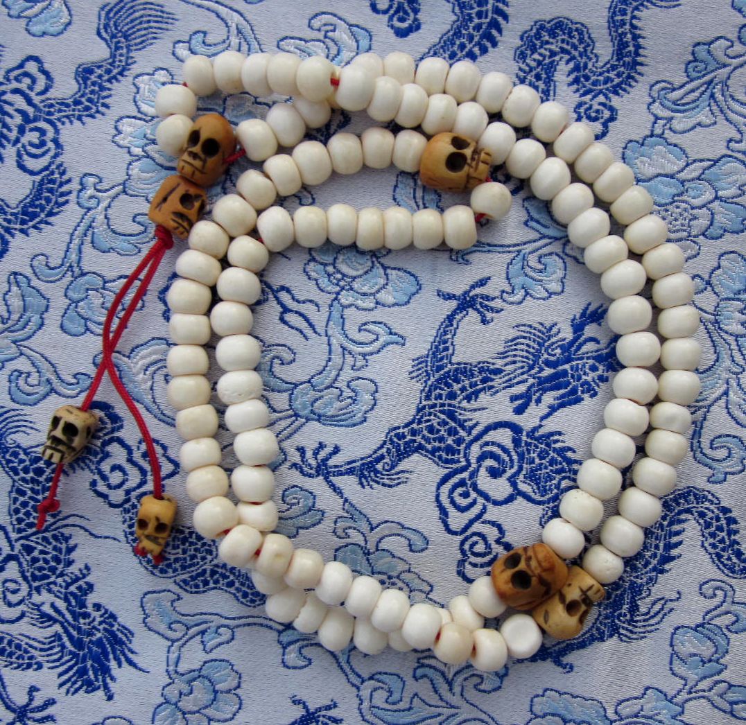 ~In addition to the traditional 27 8mm natural white bone beads, (which are wider than high, a typical configuration of most bone and wooden beads), larger tea-dyed hand-carved skull beads are used as the big guru and smaller tube bead. The same kind of beads are used as the Guru and tube bead, with the tube bead being a bit smaller. There is a lot of variability in the color tone of the skull beads: some are quite dark and others lighter in color. This is typical with hand-crafted items. ALL wrathful malas must be finished with red cord only!~