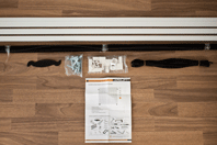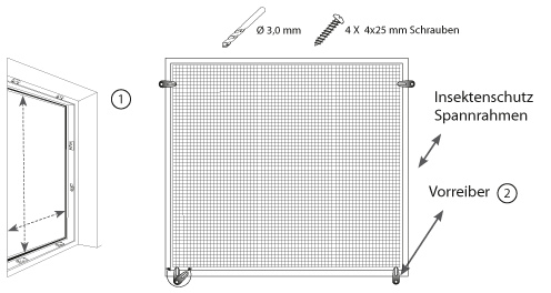 Mit den vier Vorreibern (Siehe Abb. 2) die Höhe des Insektenschutzrahmens auf dem Fensterstock bestimmen. Die unteren Vorreiber auf dem Fensterrahmen befestigen und so drehen, dass der Insektenschutzrahmen nicht abrutschen kann. Nun die oberen Vorreiber befestigen und drehen, sodass der Insektenschutzrahmen endgültig fixiert ist. Der Insektenschutzrahmen kann nun von außen, erst durch drehen der oberen, dann der unteren Vorreiber, gelöst und abgenommen werden. Lieferumfang