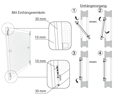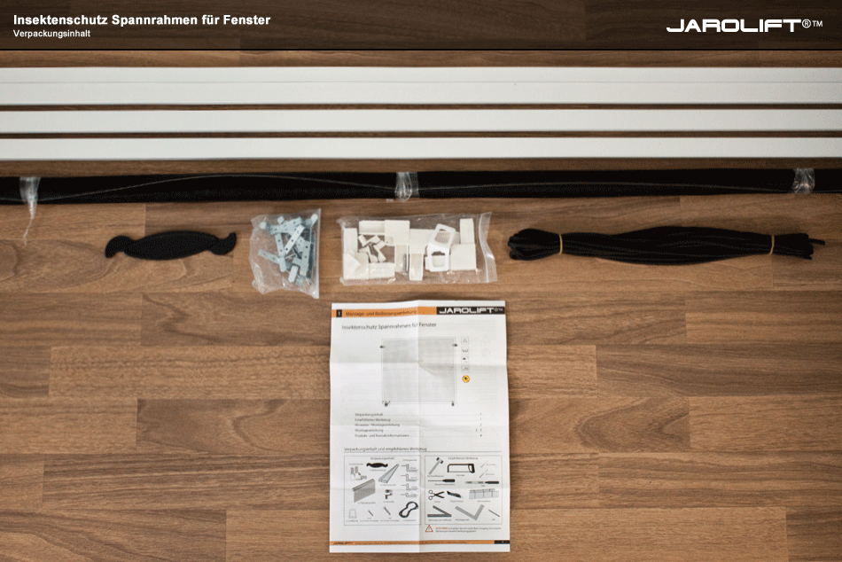 Bessere Durchsicht durch schwarzes Insektenschutzgewebe!Weiße Insektenschutzgewebe bilden einen extrem hohen Kontrast zur äußeren Umgebung, und stechen somit extrem ins Auge. Die Durchsicht ist hierbei deutlich schlechter. Dies ist in etwa mit der Funktion von weißen Scheibengardinen vergleichbar, welche Ebenso eine Schlechte Durchsicht von außen nach Innen Gewährleisten. Schwarze Fliegengitter "schlucken" dagegen den Hintergrund und sorgen somit für eine überragende Durchsicht. MontageDer JAROLIFT®™ Insektenschutz Spannrahmen wird direkt vor dem Fenster angebracht. Die Montage ist dabei einfach und kann auf zwei Arten durchgeführt werden. 1. Montageart - mit Einhängewinkel