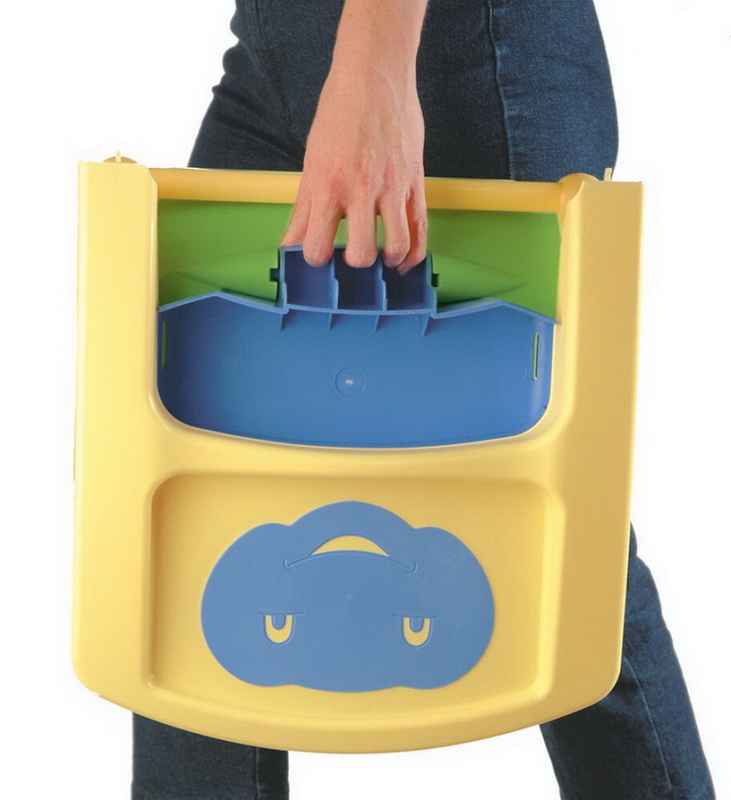 Wird die Tischplatte nicht benötigt, läßt sie sich mit einem Handgriff abnehmen und an der Rückenlehne des Sitzes fixieren. Die Tischplatte ist rutschfest beschichtet. Leicht zu tragen und platzsparend zusammenklappbar kann der Babytop®-Kindersitz überall hin mitgenommen werden.