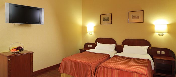 Das Hotel verfügt über 62 klimatisierte Zimmer mit speziellen schalldichten Fenstern. Wir bieten: 8 Einzelzimmer, 48 Doppelzimmer und 6 Doppelzimmer mit Extrabett. Die Einzelzimmer verfügen über Französische Betten, die Doppelzimmer verfügen über Queen Size Betten oder zwei separate Betten.