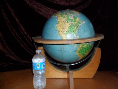 This model is a 16” Cartocraft Physical Political Globe, edited by C.B. Odell. . Capitols of each country are identified. The Horizon Ring is movable, made of wood with an overlay of veneer, which is printed. The base is also made of solid wood. The entire Globe and meridian can be removed from the base. The connecting metal dowel can be placed onto the base in two different positions. The globe is made of molded fiberboard with a lacquer finish. Height of this globe is 16 inches, total diameter, including horizon ring, is 17.5 inches! This is a very large globe!
