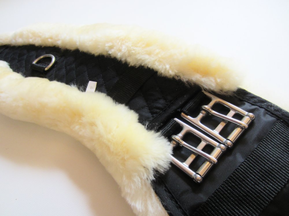 Weicher "Mondgurt" mit Lammfell, Kurzgurt - Sattelgurt PS_Z-FURGIRTHMOONDR Dieser Lammfell unterlegte Mondgurt ist ein "echter" Mondgurt , der nicht nur eine optische, anatomische Sichelform hat, sondern die vorderen Edelstahl-Rollschnallen haben bei diesem Gurt einen ca. 3 cm kürzeren Abstand als die hinteren Schnallen. Farbe:Schwarzer Baumwollsteppstoff, naturfarbendes Lammfell