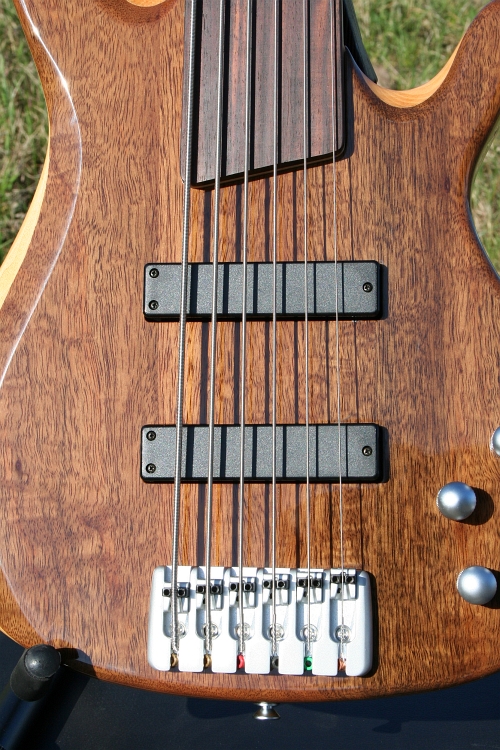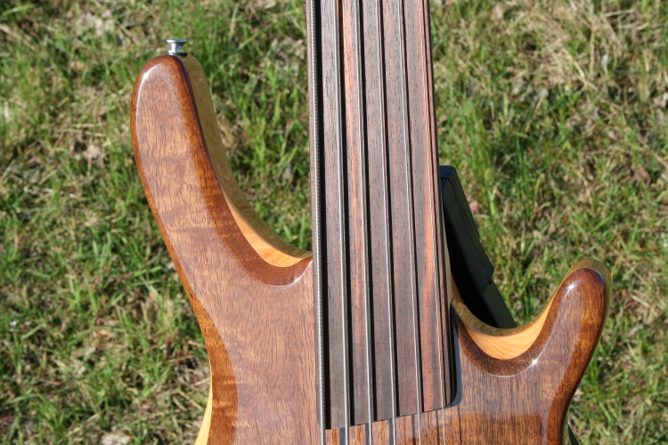 Dieser edle sechssaitige Fretless wurde im Sandwich-Verfahren gebaut. Die Decke und der Korpusboden sind aus ausgewählter AAA Walnuß mit sehr schöner Maserung und Farbstruktur. Die Mittelschicht ist aus Ahorn. Bei dieser Bauweise wird es niemals Verzug oder Risse geben! Der Body ist excellent hochglanzlackiert - keine Wellen, keine Nasen, keine matten Stellen, eben spiegelglatt! Der Hals ist seidenmatt lackiert und fühlt sich klasse an, er wurde mit 5 eingelassenen Schrauben sicher in der sauber gefrästen Halstasche verankert (Screw-In-Neckbolt). Die Schaltung des Basses ist Passiv. Zwei passive PUs von ABT (OEM) im Soap Bar-Format, intern als brummunterdrückende Split Coils konstruiert, machen richtig Druck! Die Schaltung hat Regler für 2x Volume + 2x Tonblende.