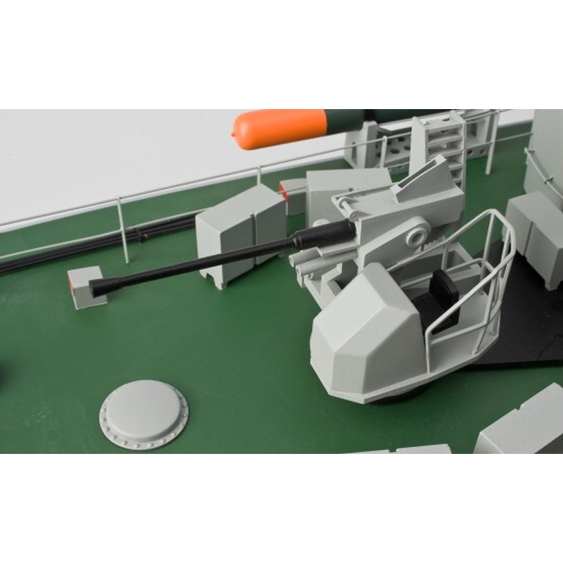 Das ferngesteuerte CARSON Premium-Torpedoboot ist ein faszinierender Nachbau des bekannten Vorbilds. Auf einer imposanten Länge von rund 850 mm zeigt es zahlreiche Details des bekannten Schnellbootes. Der filigrane Oberdeckaufbau des im Maßstab 1:48 gehaltenen Modells zeigt u.a. die vier Torpedos auf den Abrollracks sowie die zwei Verteidigungskanonen. Zwei kräftige Elektromotoren vom Typ 550 treiben parallel die zwei Schiffsschrauben an, die per wasserfestem 50 A-Fahrregler gesteuert werden. Im Heck sitzt die Ruderanlage, die per ebenfalls wasserfestem 3 kg Servo gesteuert wird. Zur Inbetriebnahme der fertig aufgebauten und lackierten CARSON Vosper Perkasa ist lediglich ein RC-System zu installieren.